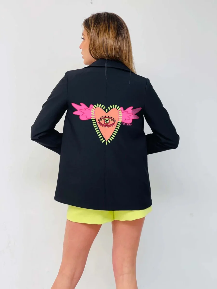 À l’arrière, un imprimé captivant représente un cœur orné d’ailes colorées, apportant une touche artistique audacieuse et moderne. Ce détail transforme le blazer en une pièce statement parfaite pour les tenues du quotidien ou des occasions spéciales.
