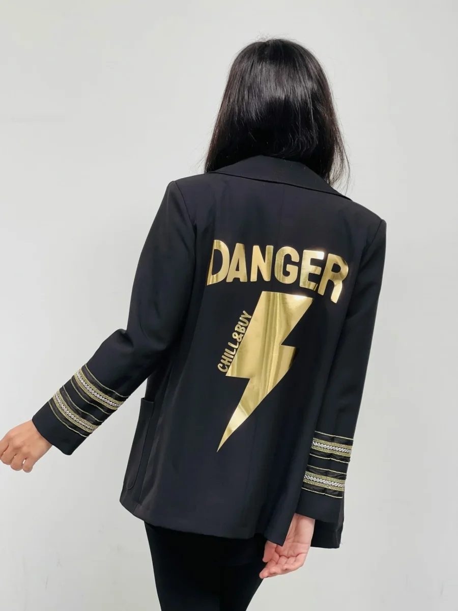 Faites sensation avec le blazer noir volants et éclair Danger, une pièce qui marie élégance et attitude urbaine.