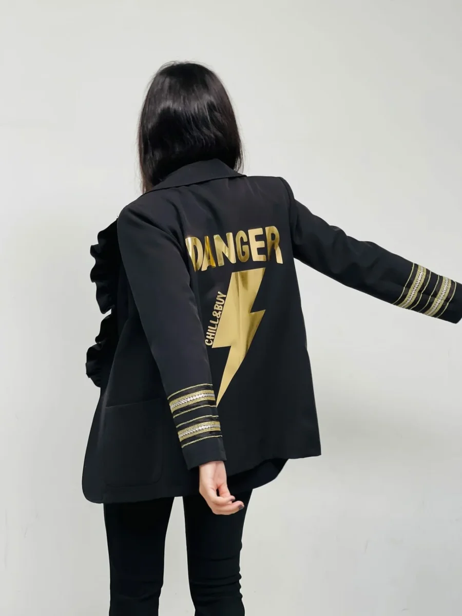 Blazer Noir Volants et Éclair Danger : Élégance avec une Touche Urbaine