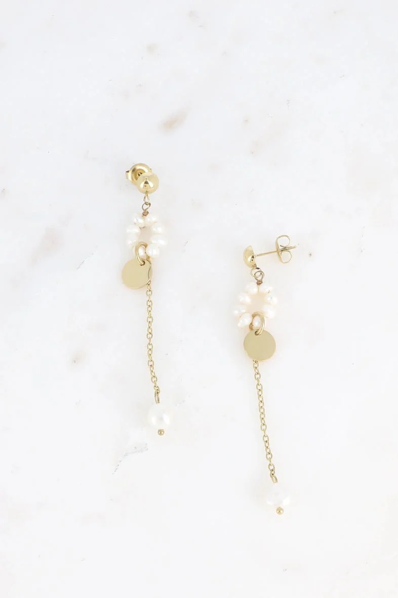 Ajoutez une touche de grâce et de modernité à votre style avec ces boucles d’oreilles pendantes en acier inoxydable. Elles combinent des éléments raffinés : un anneau embelli de perles d’eau douce, une pampille ronde, une chaîne pendante et une petite perle d’eau douce, pour un design à la fois délicat et unique.