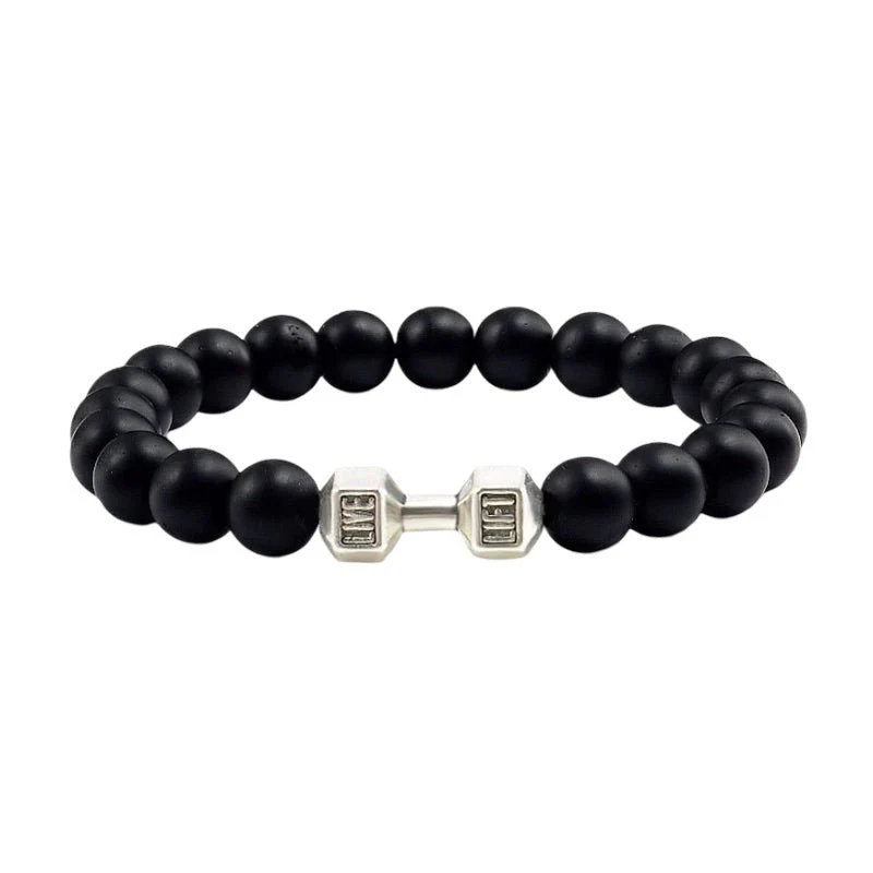 Chaque perle noire absorbe les tensions comme une roche volcanique domptée par le feu, conférant à ce bracelet une aura brute et magnétique. L’élasticité du cordon épouse naturellement le poignet, laissant le bijou respirer au rythme du corps. En son centre, une haltère miniature vient sceller l’alignement entre énergie physique et ancrage intérieur.
