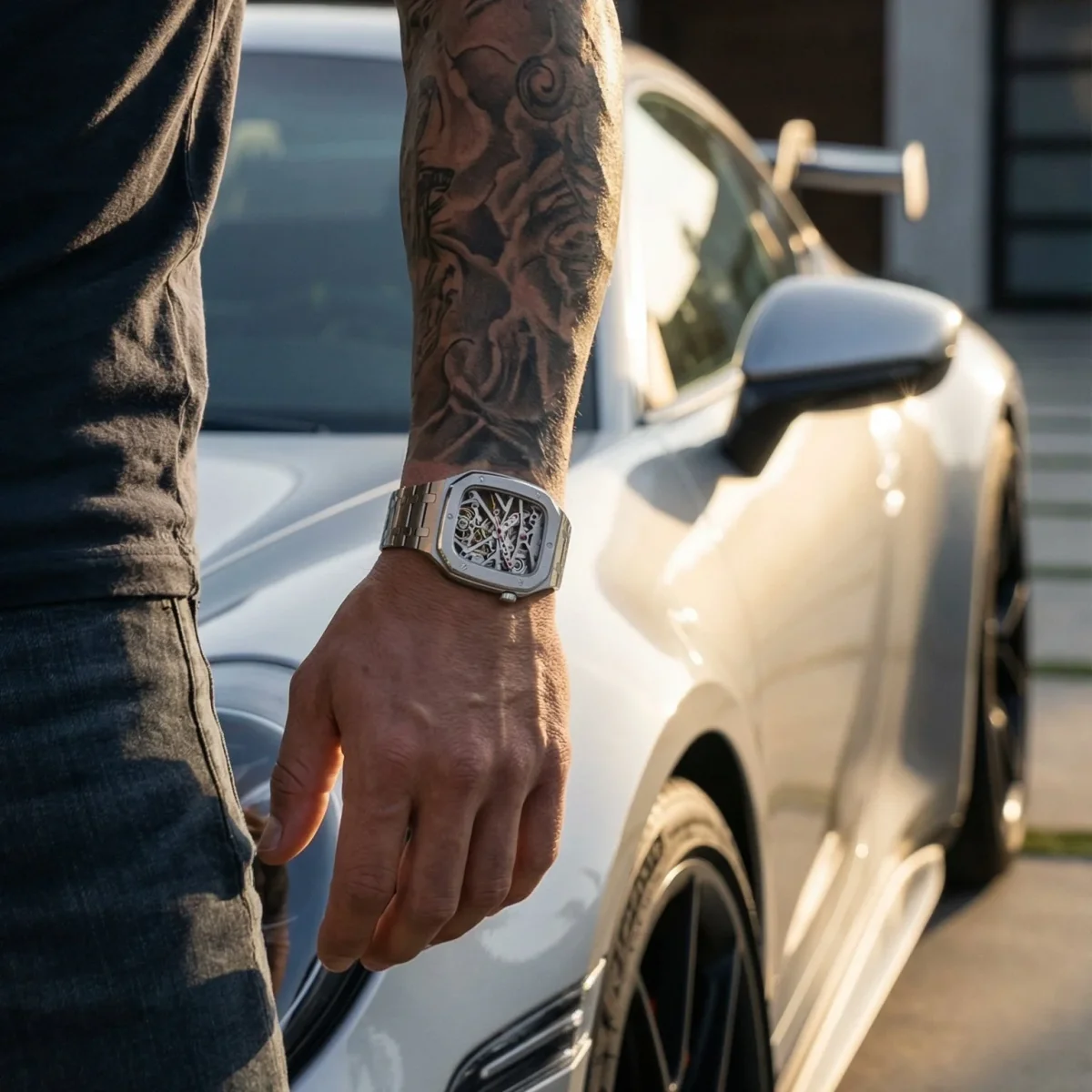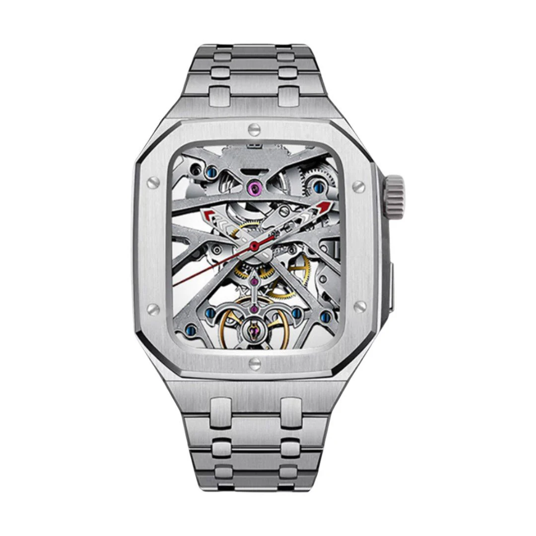 Transformez radicalement l’apparence de votre Apple Watch avec cet ensemble coque et bracelet en acier inoxydable au design inspiré des montres mécaniques de luxe. La coque ajourée donne l’illusion d’un cadran squelette, tandis que l’écran digital conserve toutes les fonctionnalités connectées. Un style affirmé qui fusionne technologie et puissance visuelle.