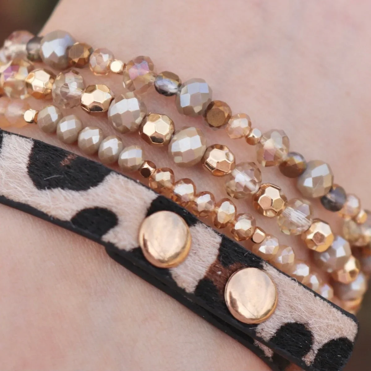 Ce bracelet à perles multiples se compose d’un lien en cuir souple rehaussé de perles facettées, nacrées et satinées dans des teintes chaudes et naturelles. Il s’enroule délicatement autour du poignet, apportant volume et féminité à votre montre. Chaque élément a été choisi pour sa brillance subtile et son confort au quotidien, avec un fermoir à bouton-pression discret qui assure un maintien parfait.