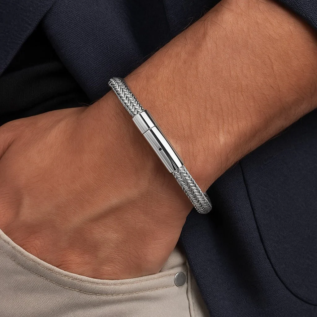 Conçu en acier inoxydable, ce bijou résiste au temps tout en épousant la forme du poignet avec souplesse. Son système de fermeture à cliquet garantit un maintien sûr, renforçant cette sensation de stabilité et de solidité. C’est un bracelet que l’on enfile comme on enfile un costume bien taillé : pour affirmer sa présence, sans forcer, avec une élégance qui n’a besoin d’aucun mot.
