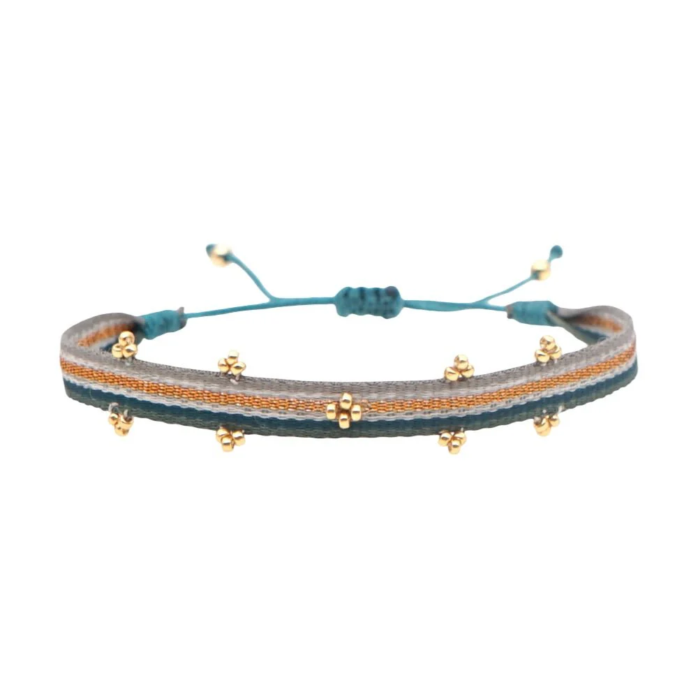 Des couleurs qui dansent, des motifs tissés avec précision, ce bracelet évoque les rues animées d’un marché sud-américain sous un ciel éclatant. Chaque fil est entrelacé avec minutie, révélant une harmonie de textures et de teintes, et parsemé de perles dorées qui captent la lumière comme des éclats de soleil.