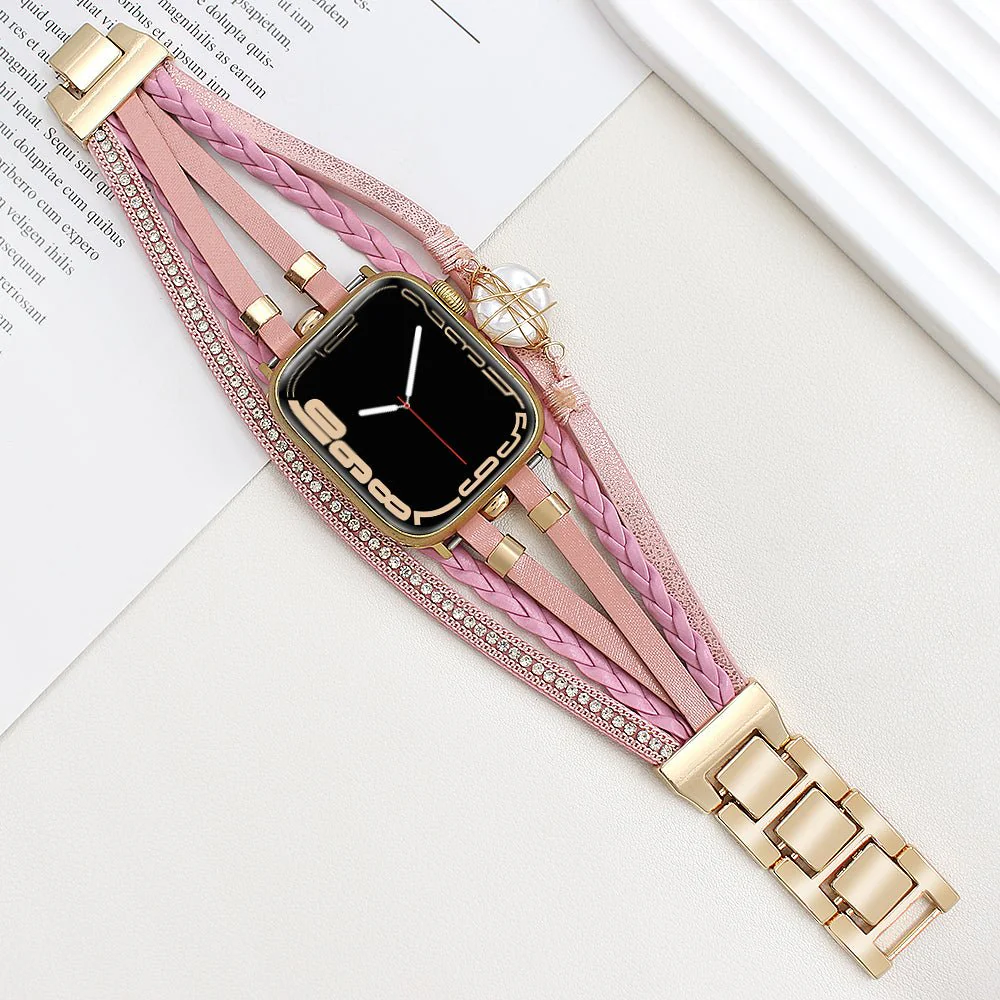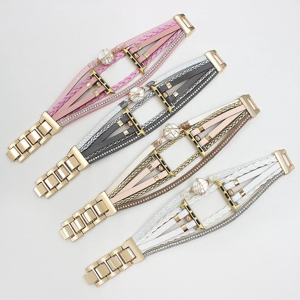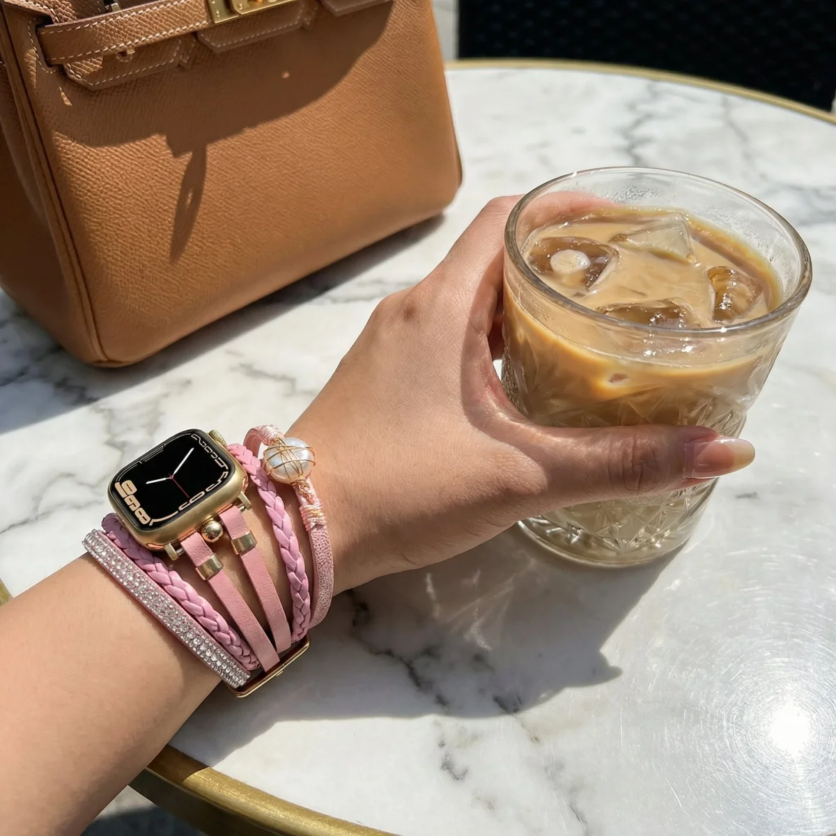 Réinvente ton poignet avec un bijou connecté qui allie élégance audacieuse et touche précieuse. Ce bracelet multi-rangs transforme ta montre en un accessoire de mode affirmé, où le cuir vegan tressé, les fils métalliques dorés et une perle d’eau douce se rencontrent dans une harmonie délicate. Chaque détail est pensé pour sublimer les courbes de ta montre tout en affirmant ton style personnel.