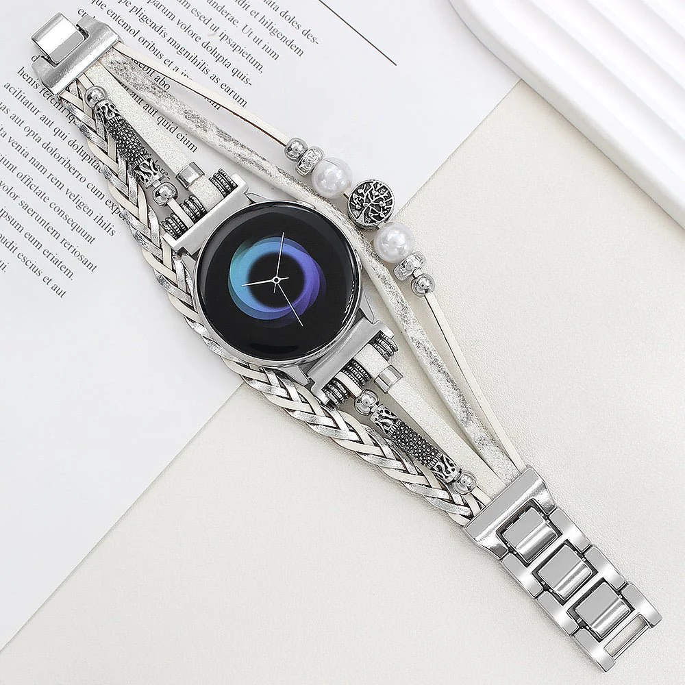 L’alliance du charme symbolique et de la technologie prend vie avec ce bracelet multi-rangs conçu pour sublimer votre montre connectée. Chaque détail a été pensé pour captiver le regard : entrelacements de microfibres tressées, éléments métalliques texturés et perles nacrées disposées avec équilibre. Le motif arbre de vie, posé avec finesse, confère une aura spirituelle et protectrice à l’ensemble.