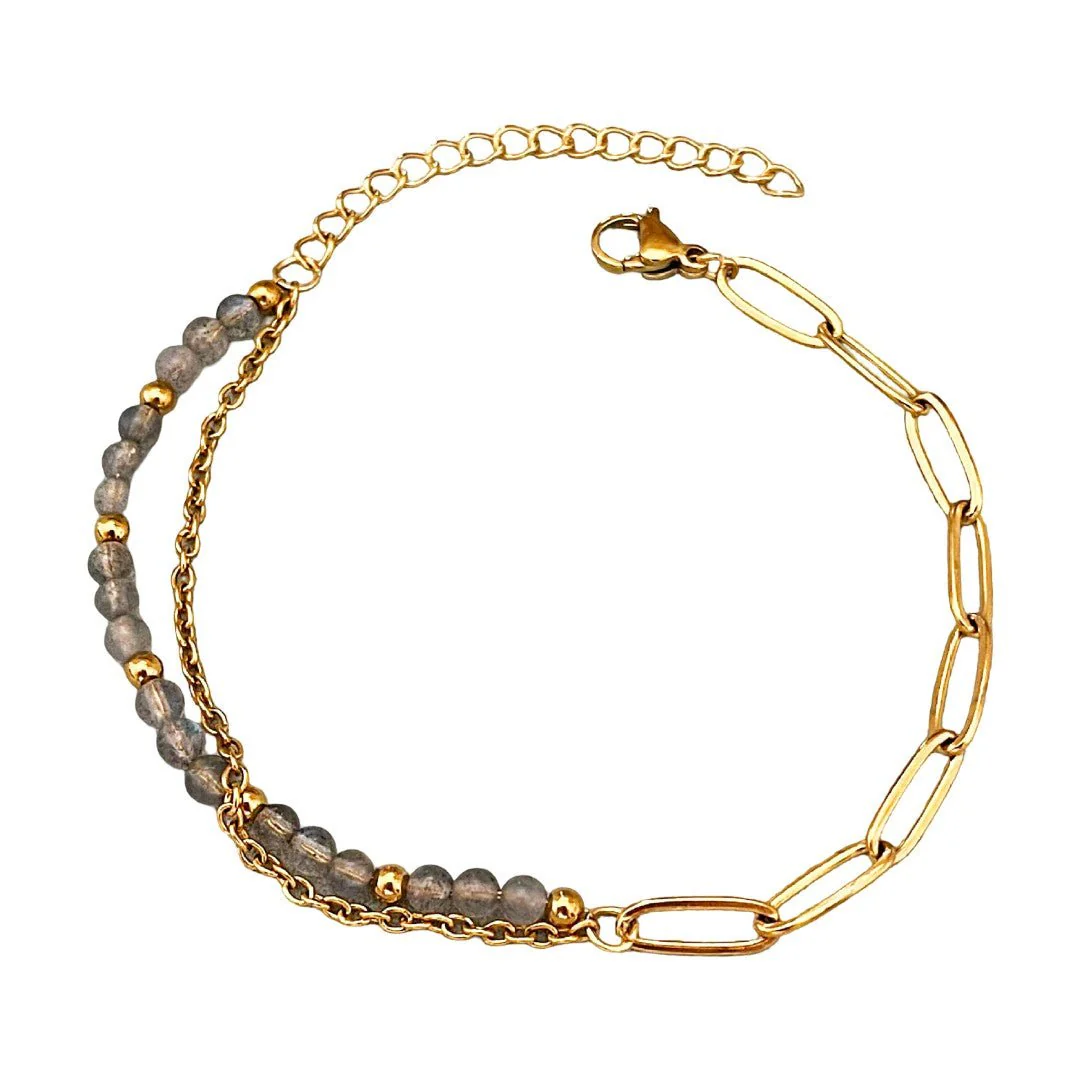 Légèrement posé sur la peau, ce bracelet révèle un charme discret et une élégance lumineuse. Il associe une fine chaîne à maille longue dorée à un délicat rang de pierres naturelles soigneusement polies, dans des nuances allant du bleu profond au gris translucide. Ce mélange subtil entre éclat doré et tonalités minérales crée une allure délicate et affirmée, parfaite pour sublimer un poignet au quotidien comme lors d’occasions spéciales.
