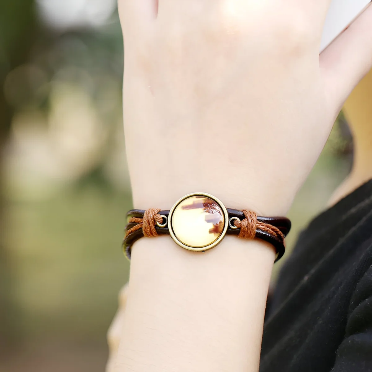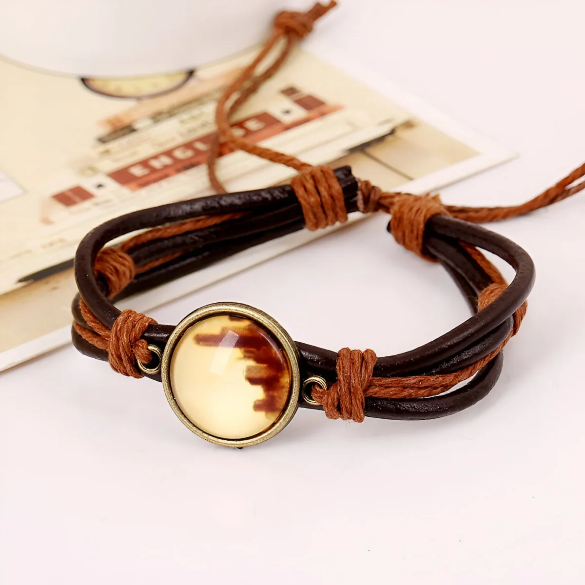 Le fermoir ajustable permet une adaptation parfaite à votre poignet, garantissant une sécurité et une commodité maximales. Ce bracelet se distingue par son design équilibré, alliant la rusticité du cuir et la sophistication des détails décoratifs. Le motif central, richement détaillé, reflète une esthétique moderne tout en évoquant des influences classiques, créant un contraste harmonieux.