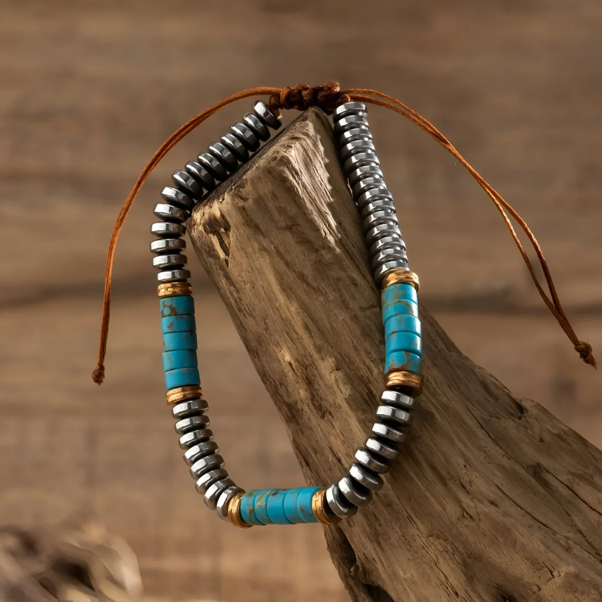Ce bijou singulier, mêlant un alliage de zinc sélectionné avec soin et des imitations de pierres turquoises, offre une présence saisissante à votre poignet. Le cordon, finement tressé, dévoile un système de fermeture coulissant qui assure un ajustement parfait pour toute taille. L’éclat subtil des éléments métalliques contraste avec la douceur des teintes des turquoises d’imitation, apportant une touche d’élégance discrète à votre ensemble.