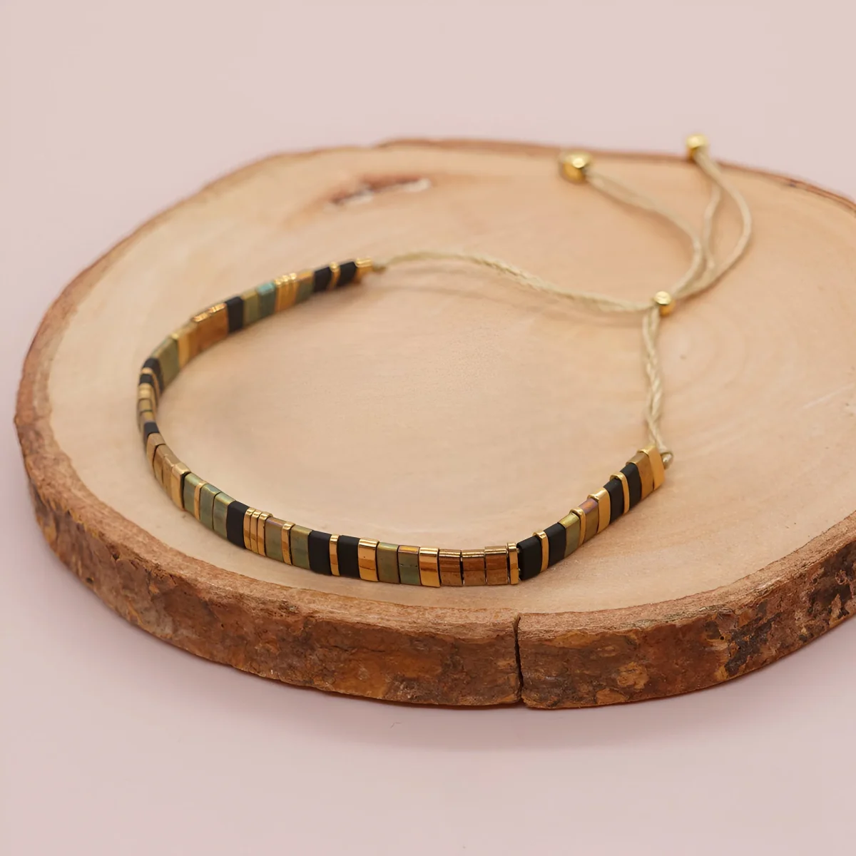 Ce bracelet délicat, conçu avec des perles japonaises minutieusement sélectionnées, offre une harmonie parfaite de teintes dorées et sombres. Les perles cubiques se distinguent par leurs reflets métalliques subtils, ajoutant une touche de raffinement discret à chaque tenue. Avec son design ajustable, ce bracelet s’adapte facilement à tous les poignets, garantissant un confort optimal et une élégance intemporelle.