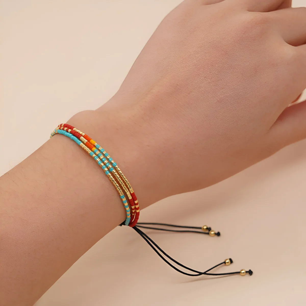 Le fermoir coulissant ajustable permet de l’adapter facilement à chaque poignet, assurant un confort optimal tout au long de la journée. Les petites perles glissent doucement sur la peau, tandis que les touches dorées apportent un éclat discret mais raffiné, parfait pour celles qui aiment les détails sophistiqués sans excès.