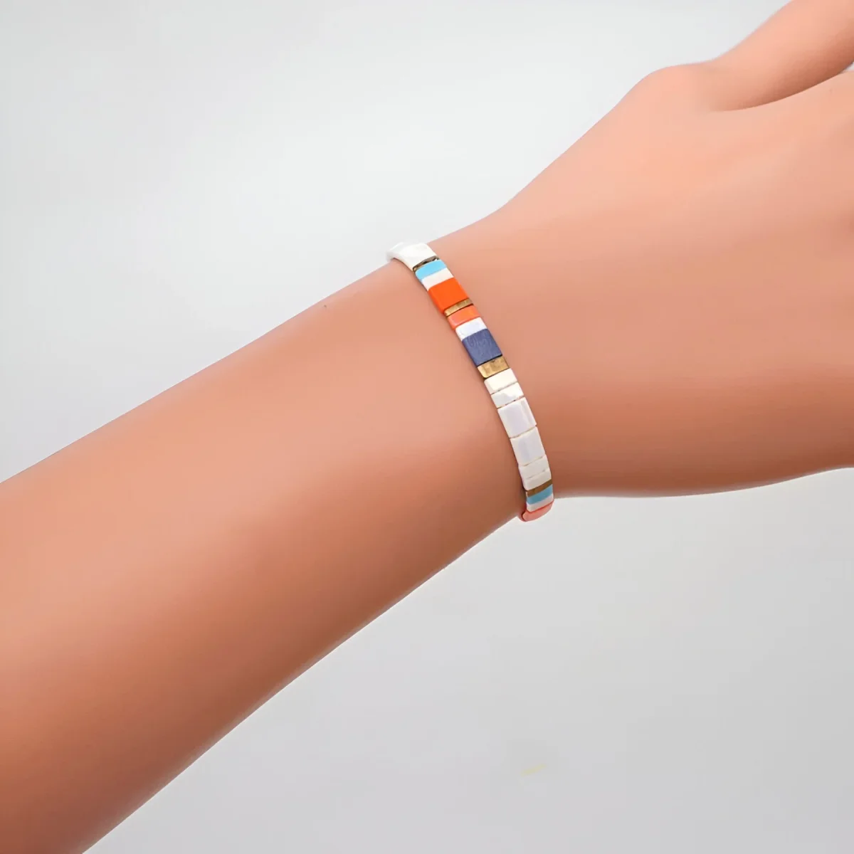 Ce magnifique bracelet en perles du Japon Tila Miyuki combine l’élégance intemporelle du verre avec des motifs enchanteurs en noir, blanc et de couleurs. Chaque perle, soigneusement sélectionnée, apporte une touche unique à ce bijou qui s’enfile aisément autour du poignet, soulignant la finesse de chaque mouvement.