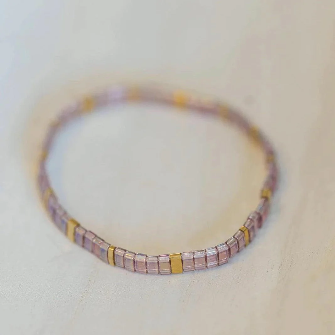 Son montage sur fil élastique invisible lui assure un confort parfait, épousant délicatement le poignet. L’assemblage des perles Tila, avec leur forme carrée et régulière, compose une ligne contemporaine et délicate, idéale en accumulation ou portée seule pour un effet chic et discret. Les détails dorés apportent une touche précieuse à l’ensemble sans en alourdir le style.