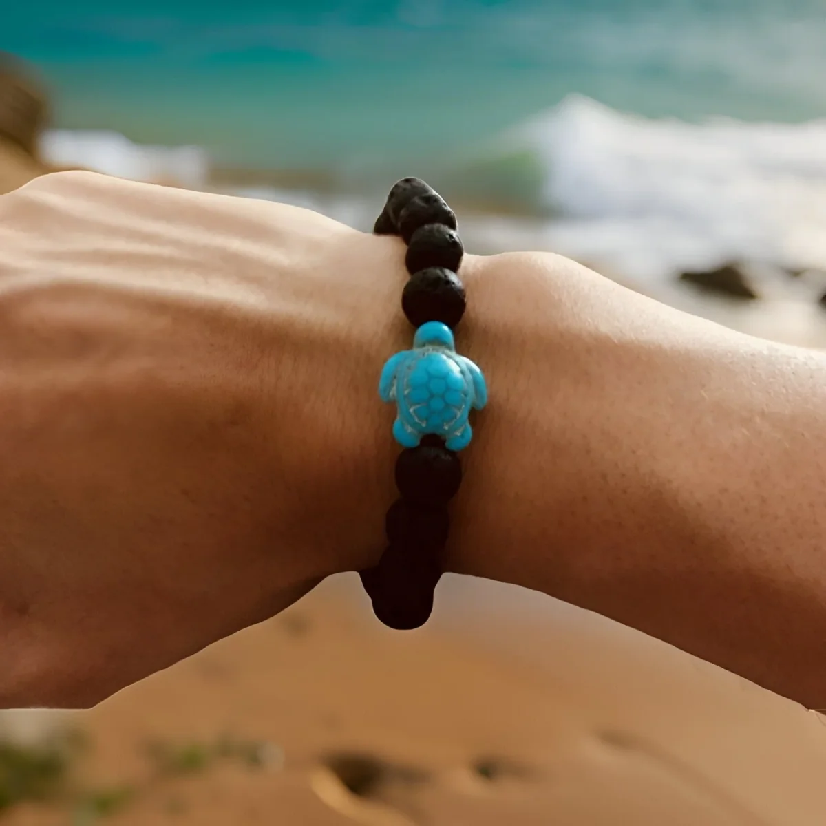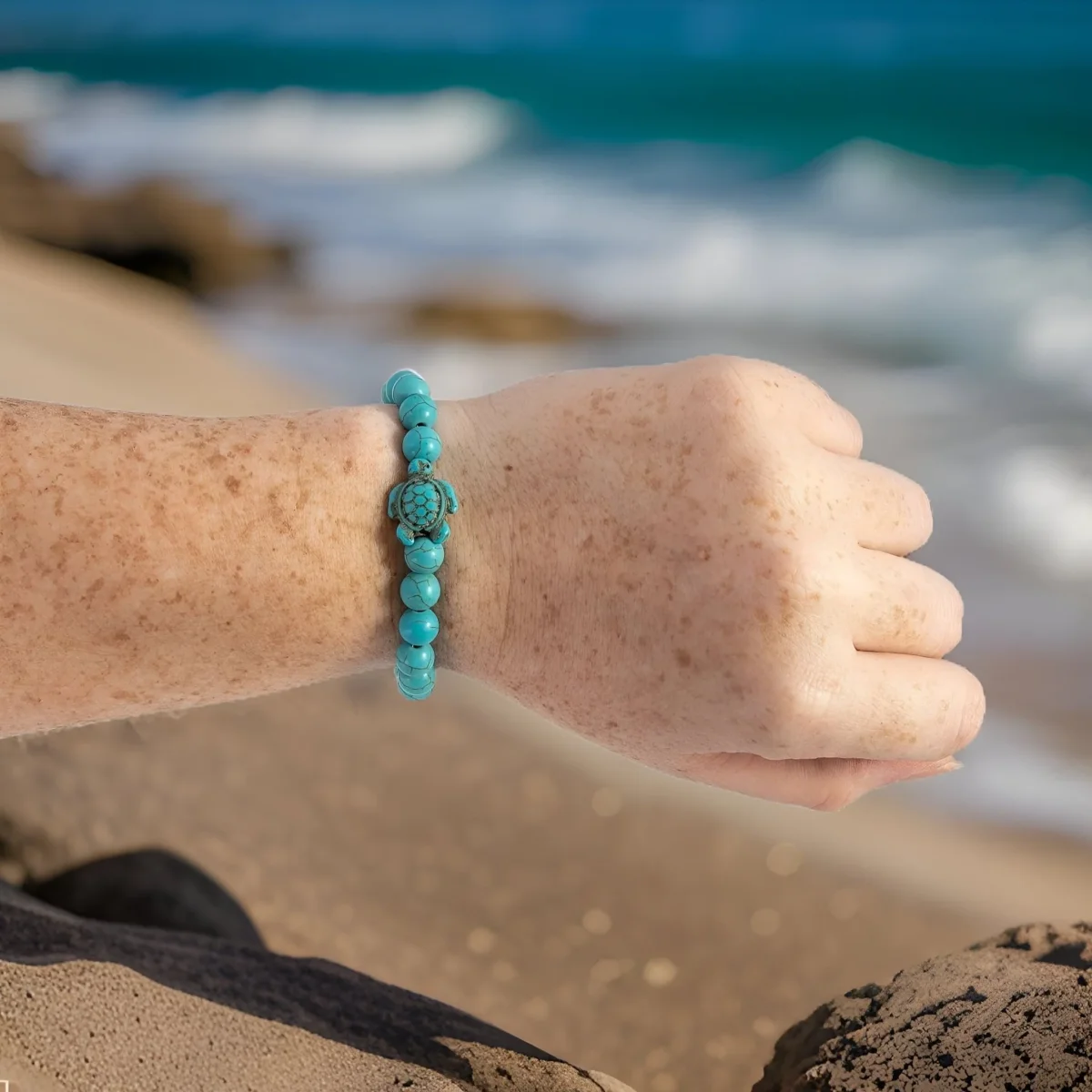 Au cœur de cette symphonie aquatique se trouve une charmante tortue en miniature, délicatement posée, telle une gardienne des mystères anciens de l’océan. Elle rappelle la longévité et la persévérance, des vertus chéries par ceux qui arborent ce bijou. Le bracelet, doté d’un fermoir élastique, s’adapte aisément à tous les poignets, promettant une expérience de confort sans égale tout en évoquant la fluidité de l’eau.