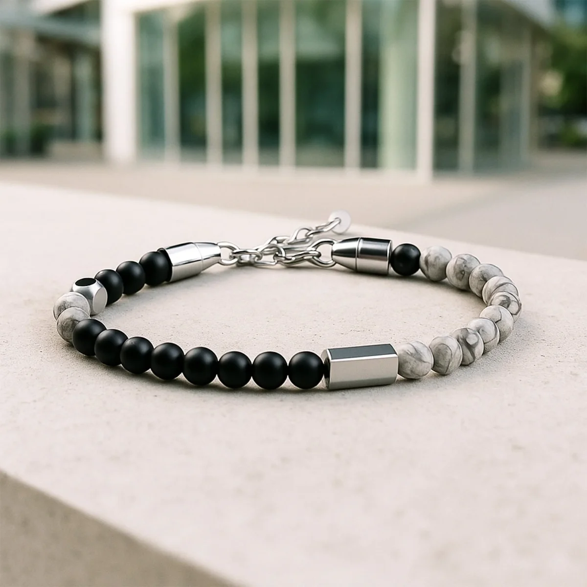 Chaque perle de pierre naturelle est sélectionnée pour sa texture et sa couleur, formant un ensemble fluide et parfaitement proportionné. Les inserts en acier inoxydable soulignent la structure du bracelet avec une précision géométrique, offrant un contraste moderne et raffiné. Son fermoir mousqueton et sa chaîne ajustable assurent un porté sûr et confortable, quel que soit votre style.