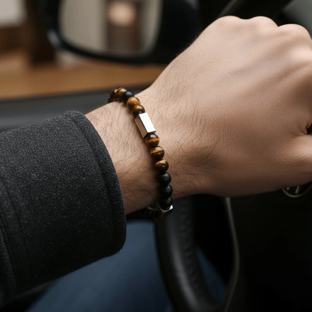 L’élégance se cache parfois dans le silence des détails. Ce bracelet s’impose discrètement au poignet, tissant une harmonie entre les teintes chaudes de l’œil de tigre et la profondeur mate des perles sombres. Son alternance subtile de matières évoque une dualité parfaitement maîtrisée, comme un équilibre entre force intérieure et calme apparent.