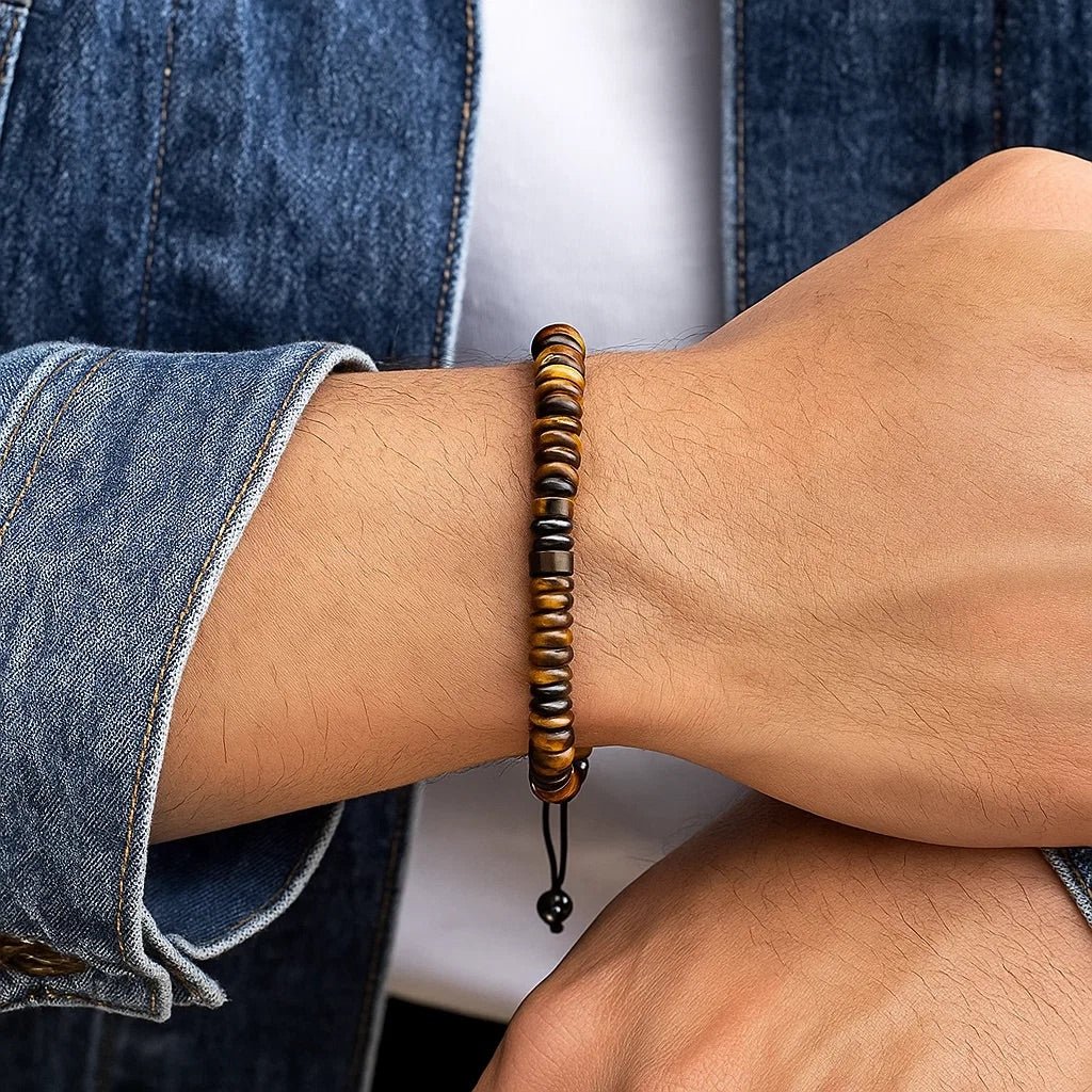 Sa structure à perles plates empilées donne une silhouette dynamique et équilibrée, tout en procurant une sensation douce au poignet. Les pierres varient subtilement selon les modèles : de la profondeur de l’obsidienne noire à la lumière chaude de l’œil de tigre, en passant par les jeux chromatiques de l’agate et de l’aventurine. Ce bijou invite à exprimer sa singularité avec élégance.