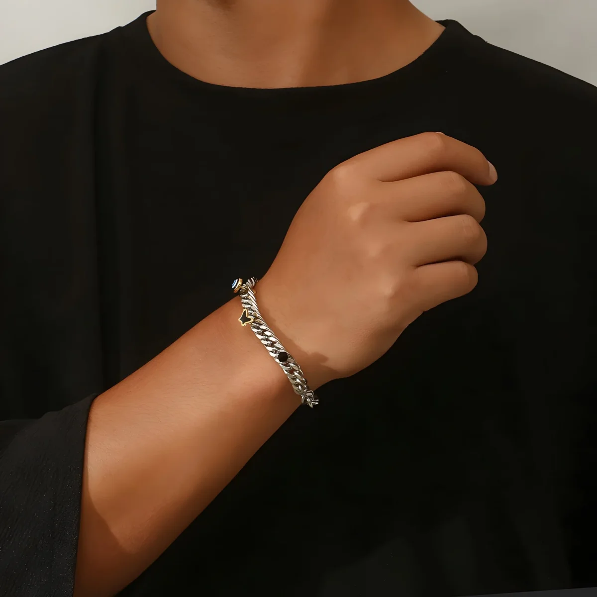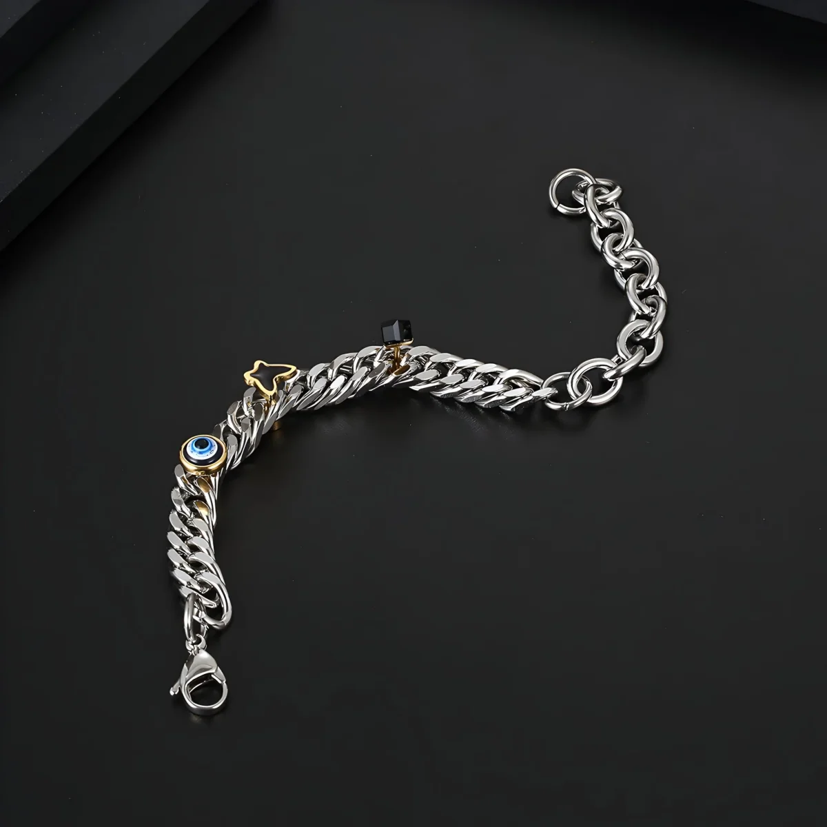 Plus qu’un simple bijou, ce bracelet est un talisman pour l’homme moderne. L’œil de protection doré, symbole universel de vigilance, est subtilement intégré, offrant une touche de mystique à celui qui le porte. Quant au papillon, également présenté en doré, il incarne la transformation et la liberté, inspirant une évolution personnelle positive.