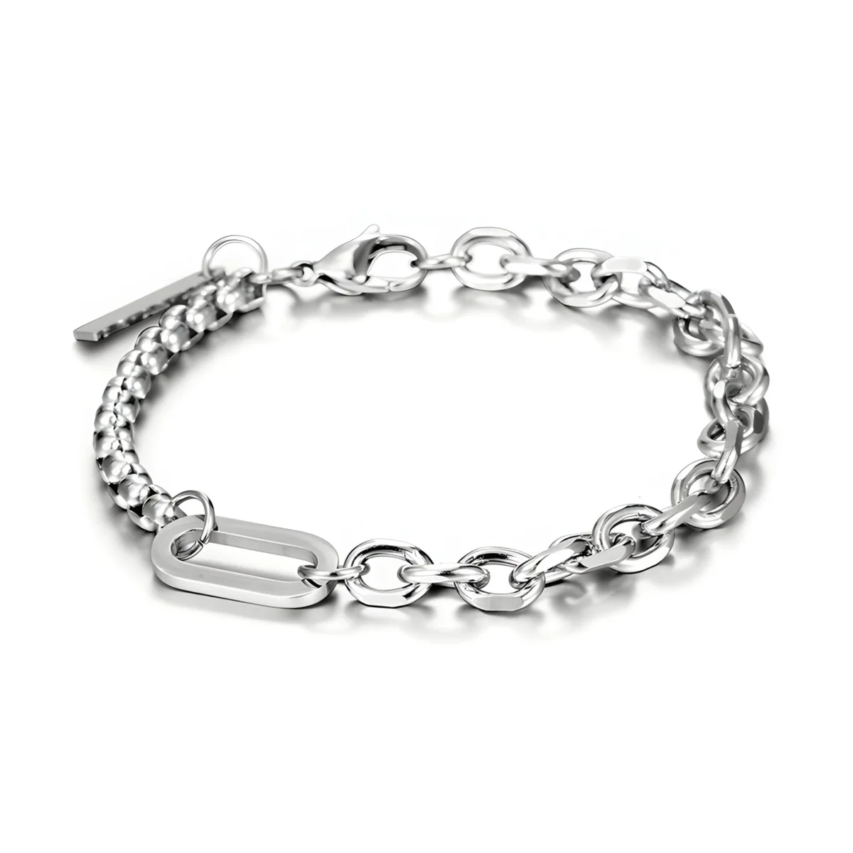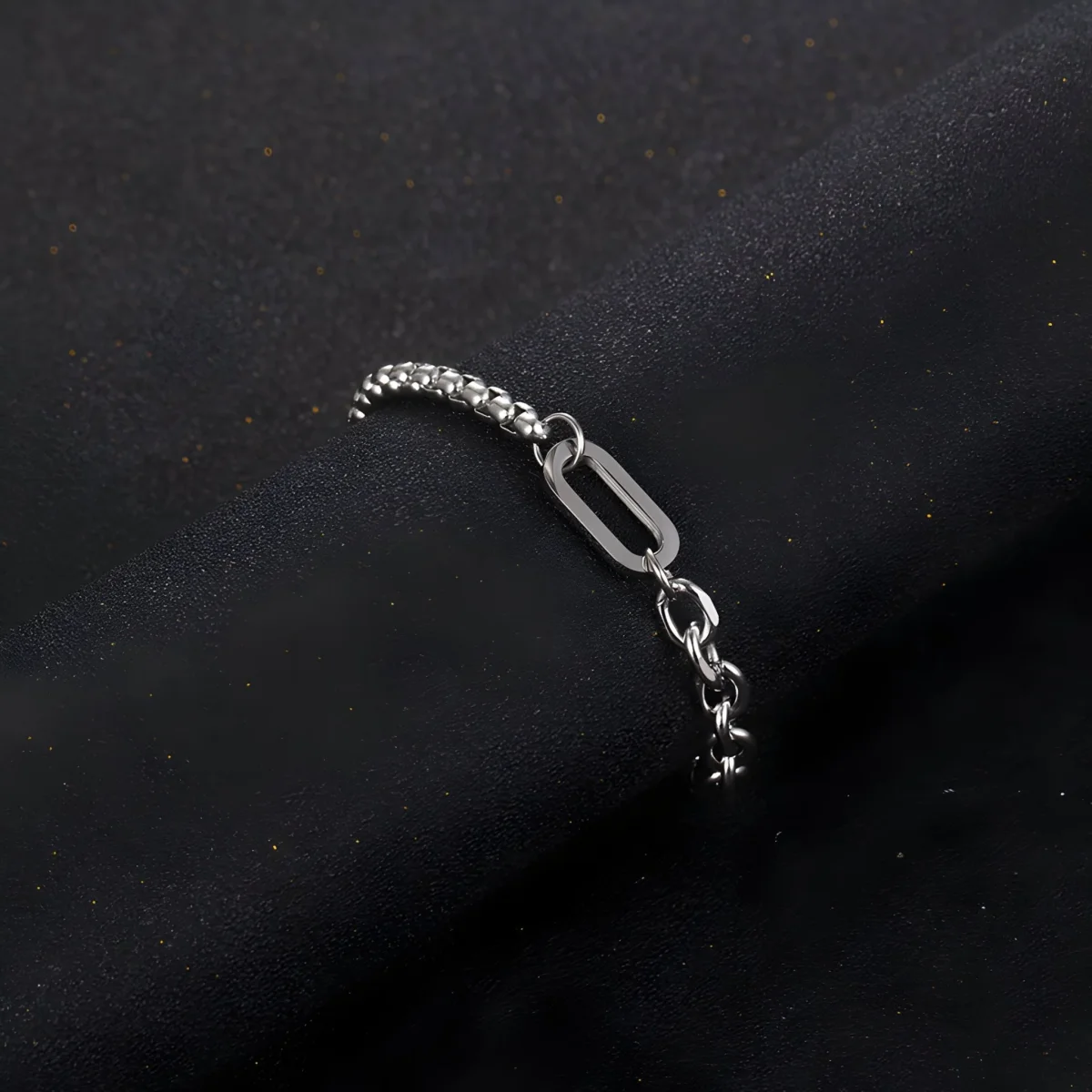 Le titane sélectionné pour ce bracelet masculin est reconnu pour sa durabilité exceptionnelle. Synonyme de résistance, ce métal se distingue par son éclat subtil qui ne ternit pas avec le temps. Les maillons soigneusement assemblés alternent entre la robustesse de la maille forçat et l’élégance de la maille vénitienne, offrant un design à la fois simple et raffiné. L’éclat du titane capte la lumière, reflétant la personnalité de celui qui le porte.