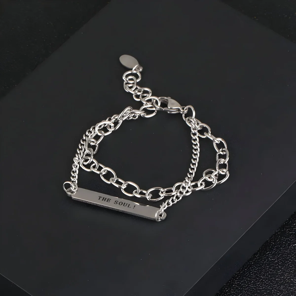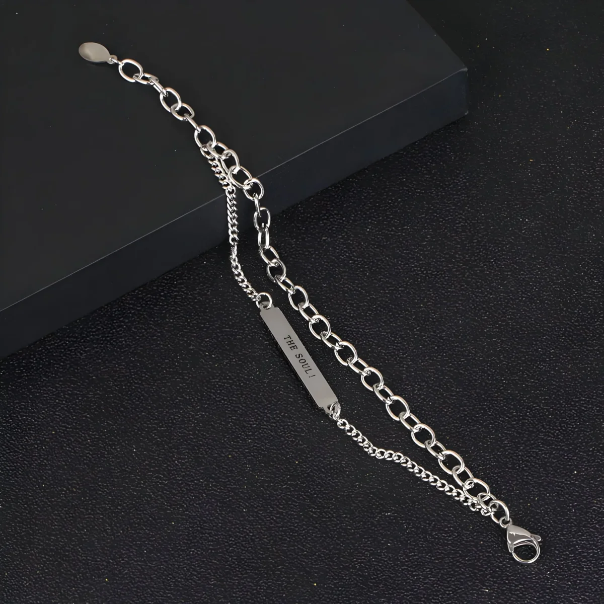 La particularité de ce bijou réside dans son mécanisme extensible jusqu’à 3 cm, offrant une flexibilité inégalée et un confort personnalisé. Qu’il s’agisse d’une journée de travail ou d’une soirée élégante, sa capacité d’adaptation est une promesse de bien-être au quotidien. L’inscription « The Soul! » gravée en lettres distinctes sur le tag central inspire une réflexion sur l’essence de celui qui le porte, en faisant plus qu’un simple accessoire, un reflet de son identité.