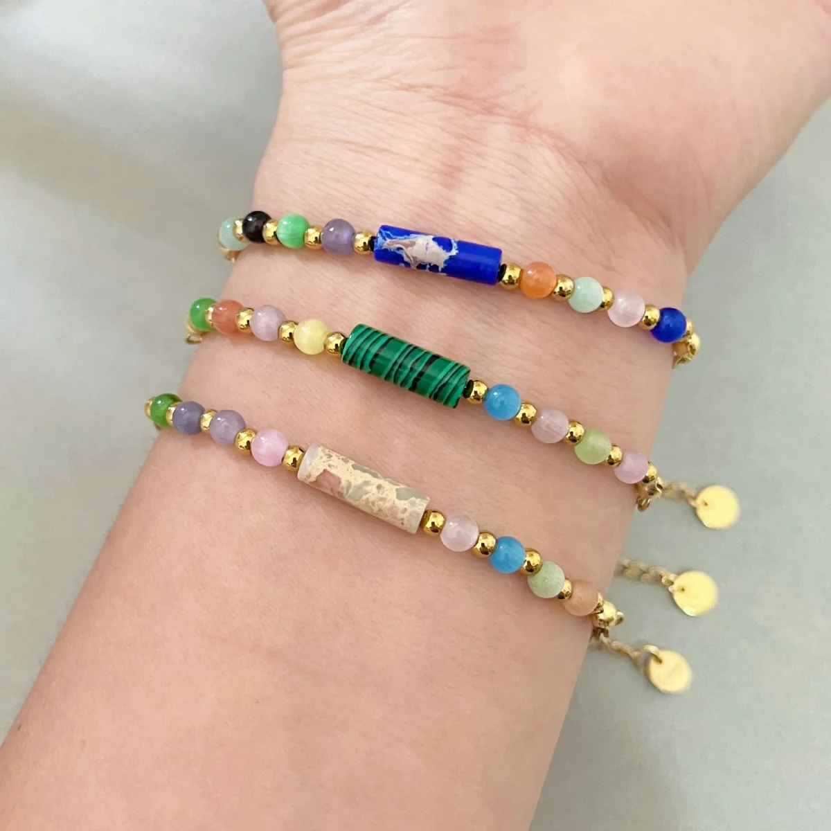 Ce bracelet associe la finesse d’une chaîne dorée à l’éclat délicat de perles colorées, créant un équilibre subtil entre légèreté et caractère. Chaque perle apporte une nuance douce et lumineuse, tandis que la pierre naturelle centrale, de forme cylindrique, capte immédiatement le regard. L’ensemble dessine une ligne fluide autour du poignet, facile à porter et agréable au toucher.