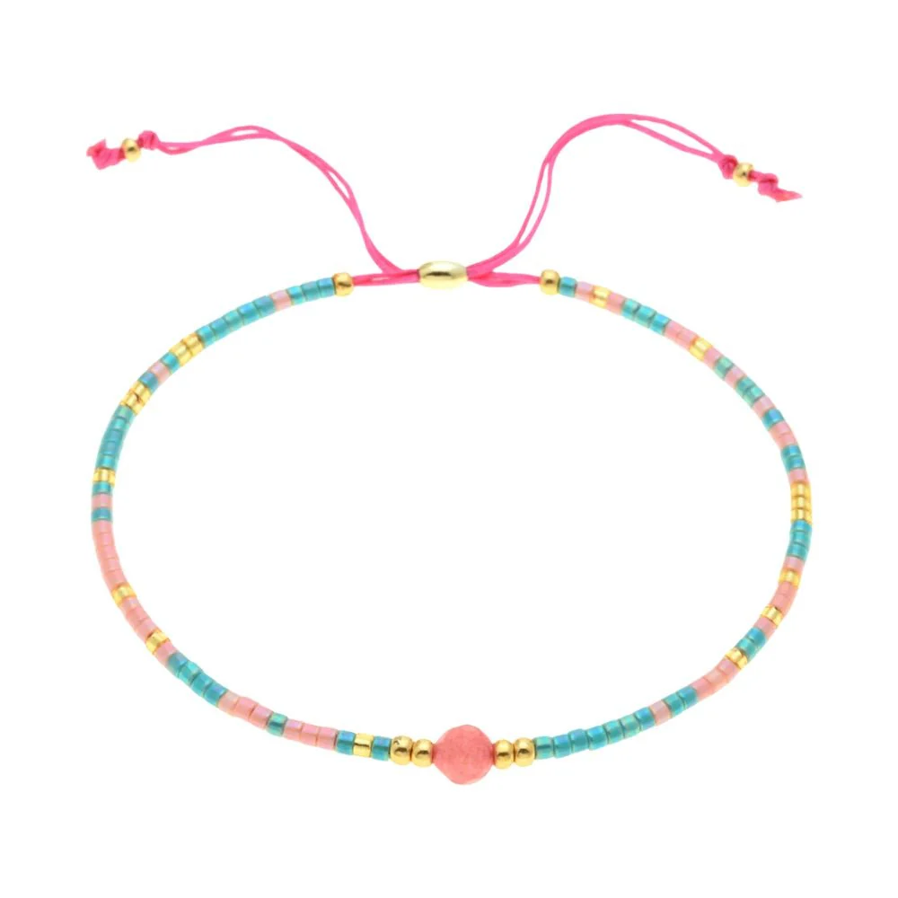 Son cordon coulissant en nylon permet un ajustement parfait à tous les poignets, ajoutant une touche pratique à sa beauté délicate. Le contraste entre le fil vibrant et les perles géométriques lui confère un style affirmé, sans excès. Chaque détail est pensé pour faire de ce bijou un compagnon du quotidien, à la fois discret et rayonnant.