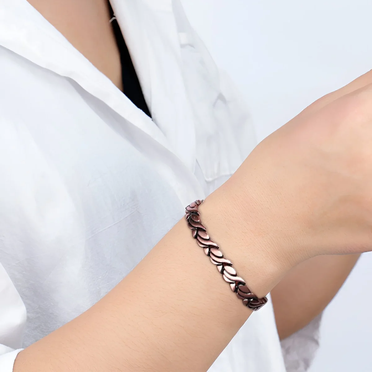 Ce bracelet en cuivre se distingue par son design élégant et ses bienfaits potentiels pour la santé. Conçu avec des mailles soigneusement élaborées, il épouse parfaitement le poignet pour offrir un confort optimal tout au long de la journée. Le cuivre, réputé pour ses propriétés bénéfiques, contribue à un bien-être général, tandis que l’intégration discrète des aimants peut favoriser un effet apaisant grâce au magnétisme.
