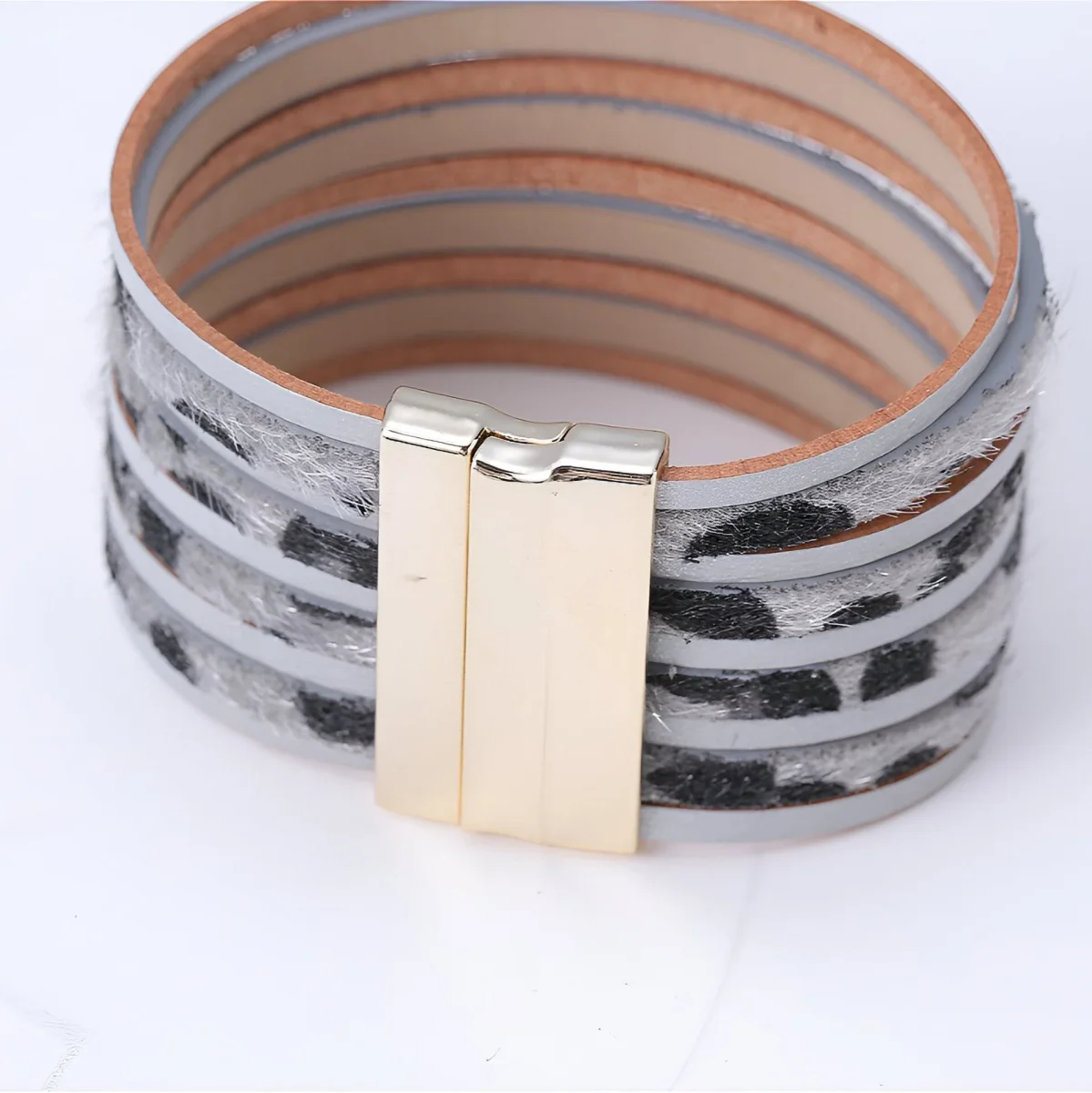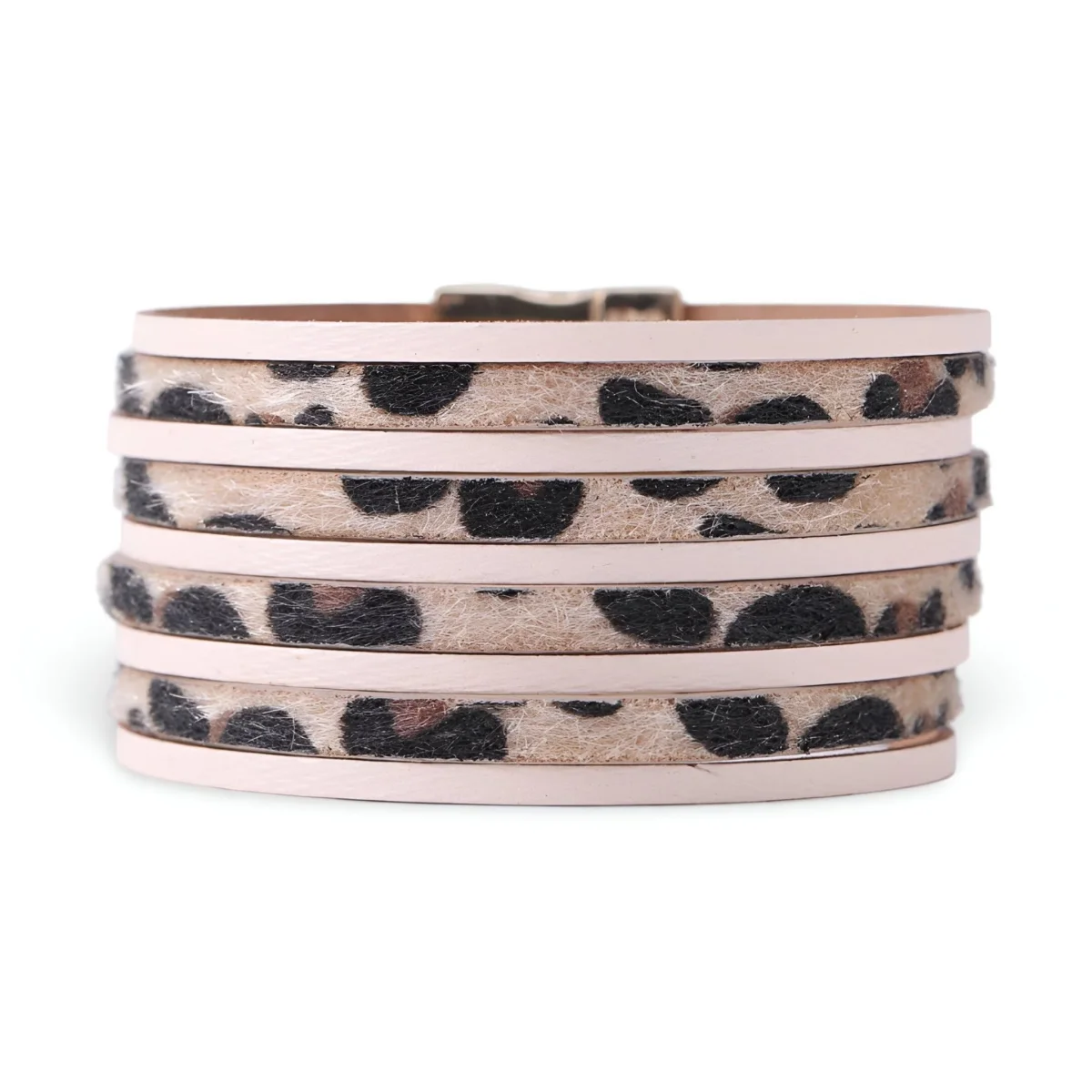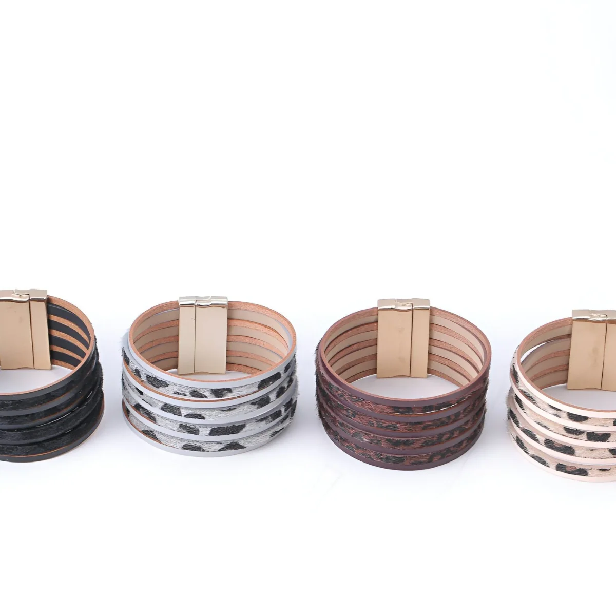 Le fermoir magnétique garantit une tenue sécurisée tout en offrant une grande facilité d’utilisation. Sa structure à plusieurs cordons ajoute de la profondeur et du volume à votre poignet, créant une impression de superposition sophistiquée. Le motif léopard apporte une touche sauvage et originale, s’accordant parfaitement à un look casual chic ou plus décontracté.