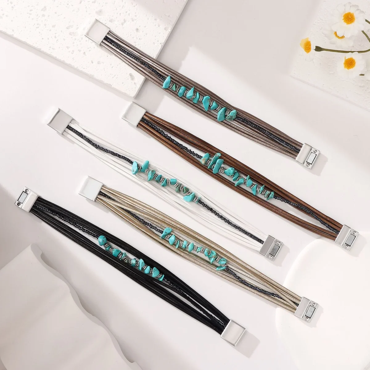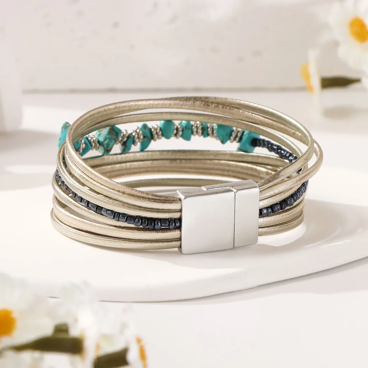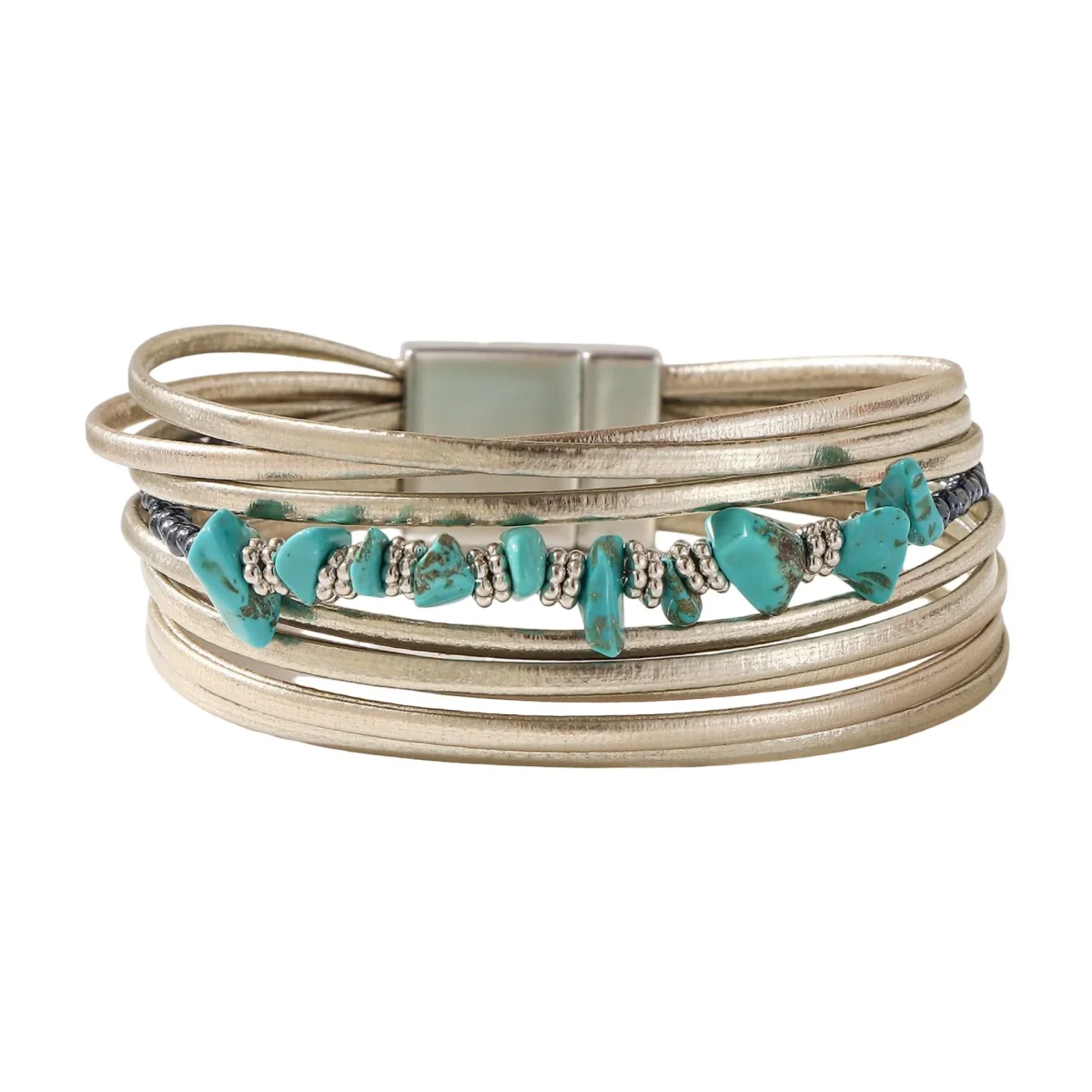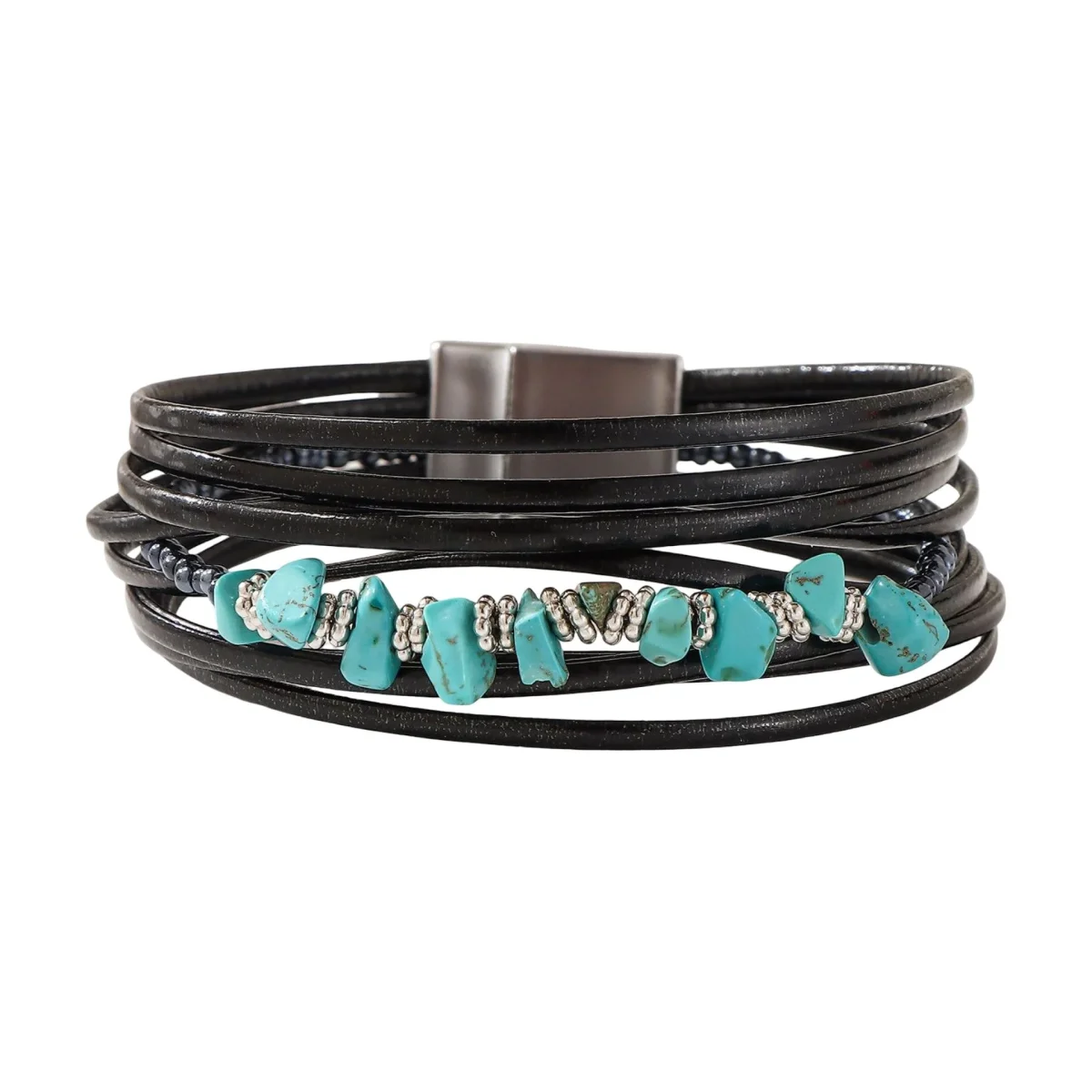 Ce bracelet multi-rangs en cuir révèle un caractère affirmé et une douceur visuelle en parfaite harmonie. Sa construction en couches souples enlace le poignet avec une aisance naturelle, tandis que le jeu de textures donne vie à une esthétique libre et maîtrisée. La présence de pierres turquoise aux formes irrégulières, enfilées sur un fil central, introduit une note organique, presque sauvage, contrastant avec l’éclat discret des perles argentées qui les accompagnent.
