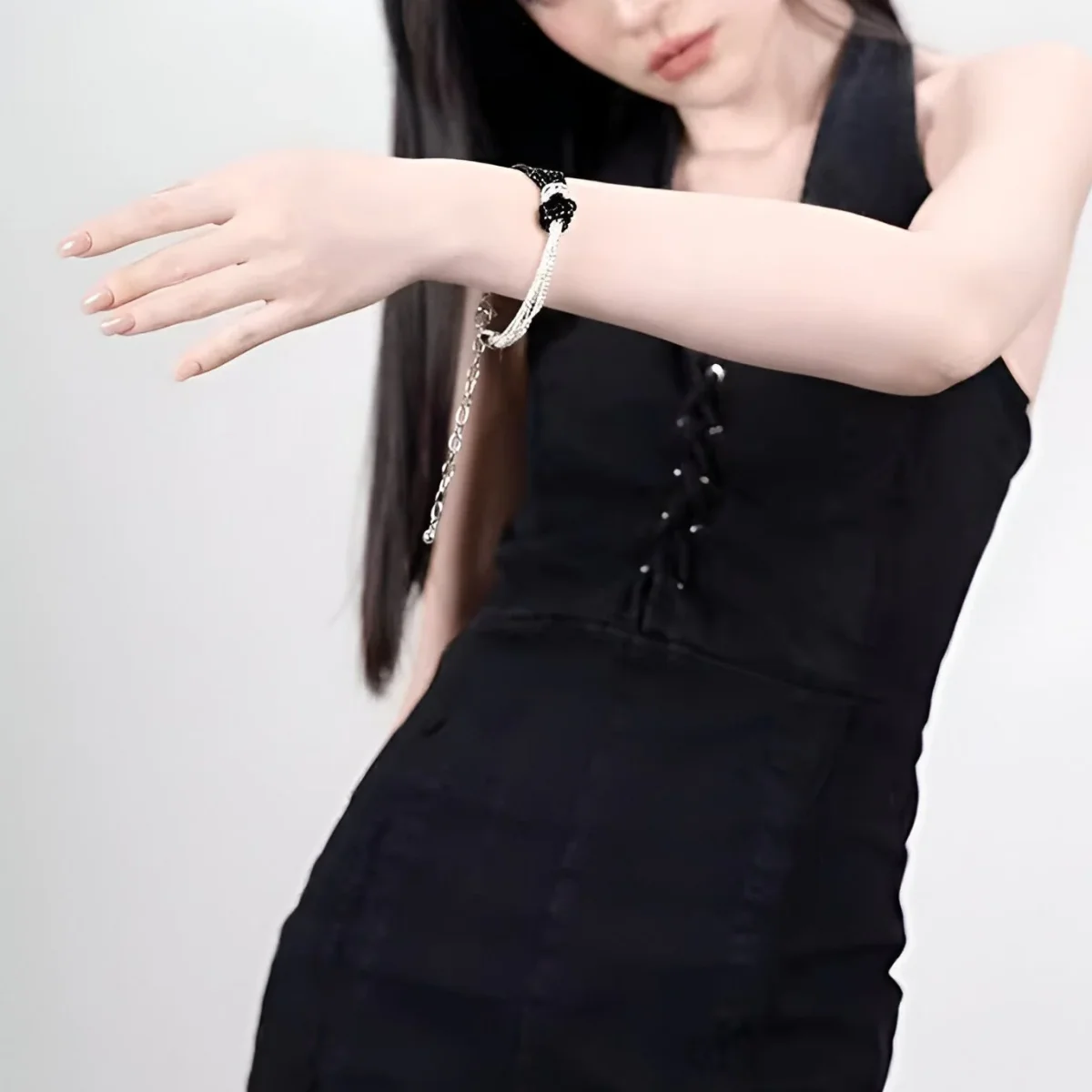 Ce bracelet unique se distingue par son élégant contraste de couleurs et sa conception sophistiquée. Le mélange subtil de perles noires et argentées s’entrelace pour former un nœud central, symbole d’un lien fort et harmonieux. Ce jeu de textures et de tons offre une touche de raffinement à toute tenue, tout en captant la lumière avec éclat.