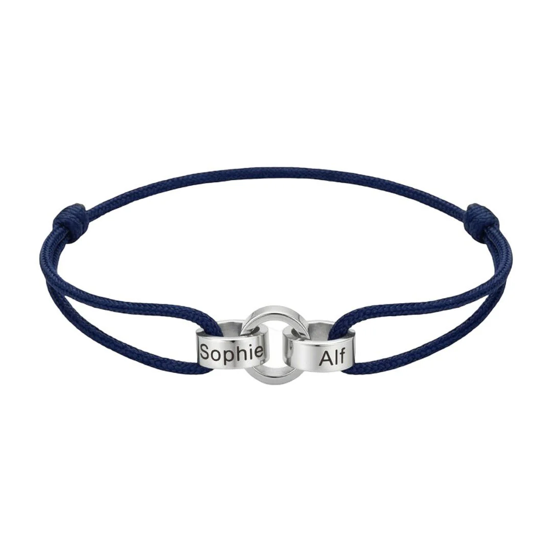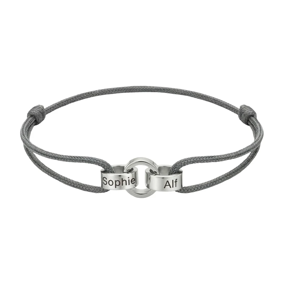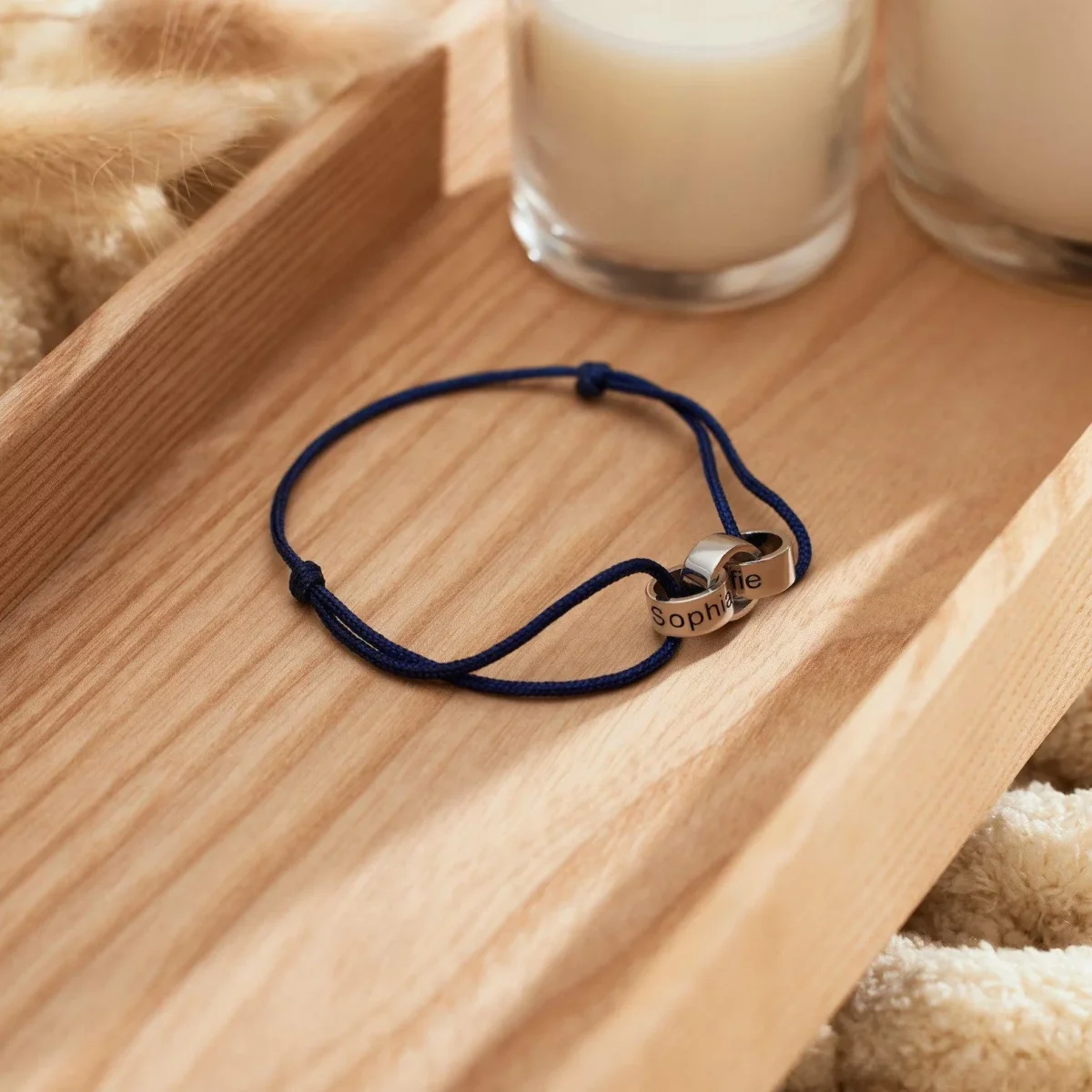 Il y a des liens que rien ne peut briser. Ce bracelet à cordon personnalisé incarne cette promesse silencieuse. Ses anneaux entrelacés gravés symbolisent deux chemins qui se rejoignent pour ne former qu’un. Chaque prénom inscrit devient une déclaration intime, discrète mais puissante. Léger au poignet, il accompagne chaque geste du quotidien comme un rappel constant d’une présence chère, même à distance.