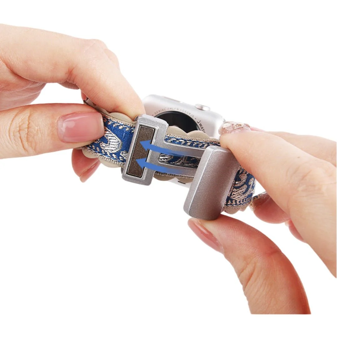 Un seul regard suffit pour sentir l’harmonie entre raffinement et confort. Ce bracelet pour Apple Watch mêle avec subtilité une broderie texturée aux motifs inspirants à une doublure en cuir souple qui épouse délicatement le poignet. Chaque mouvement révèle une touche de style discret, pensé pour accompagner votre quotidien avec grâce.