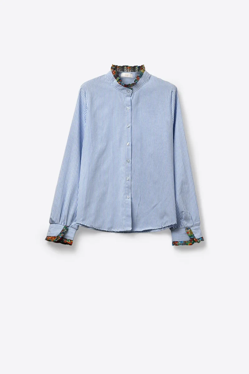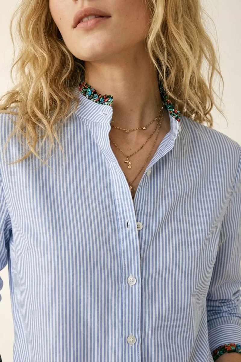 Chemise femme rayee bleu clair avec col montant et details floraux