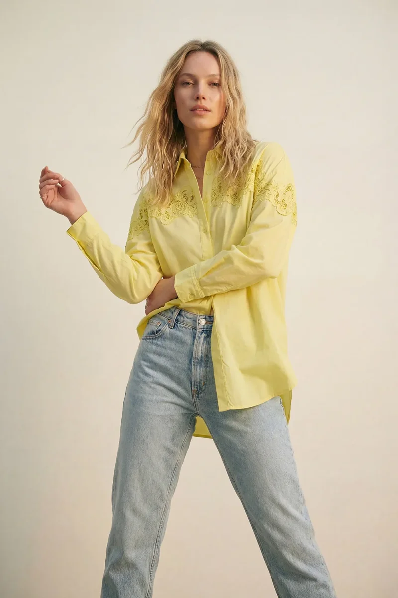 Illuminez votre vestiaire avec cette chemise jaune en popeline oversize, pensée pour une silhouette moderne et structurée. Sa coupe ample associée à de délicats détails en dentelle crée un équilibre subtil entre allure contemporaine et finitions féminines.