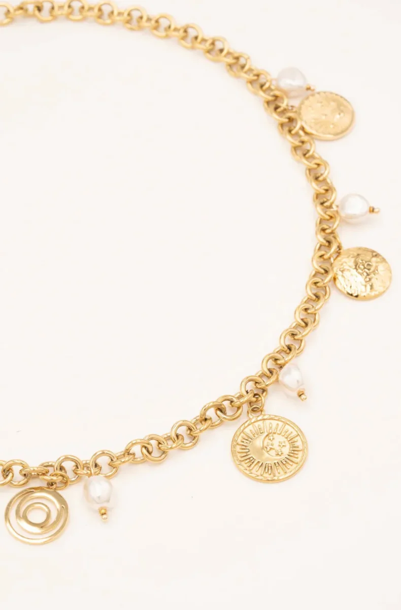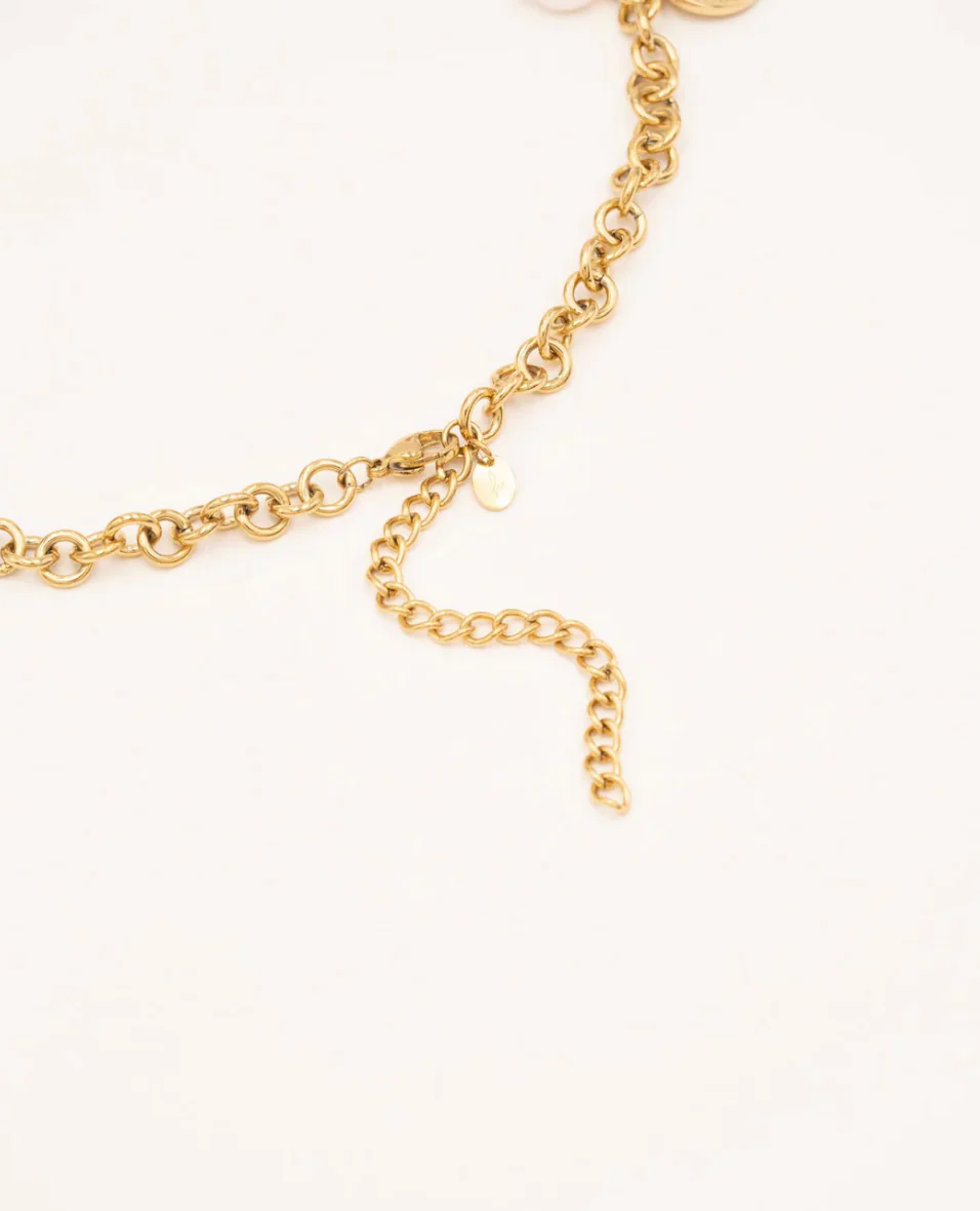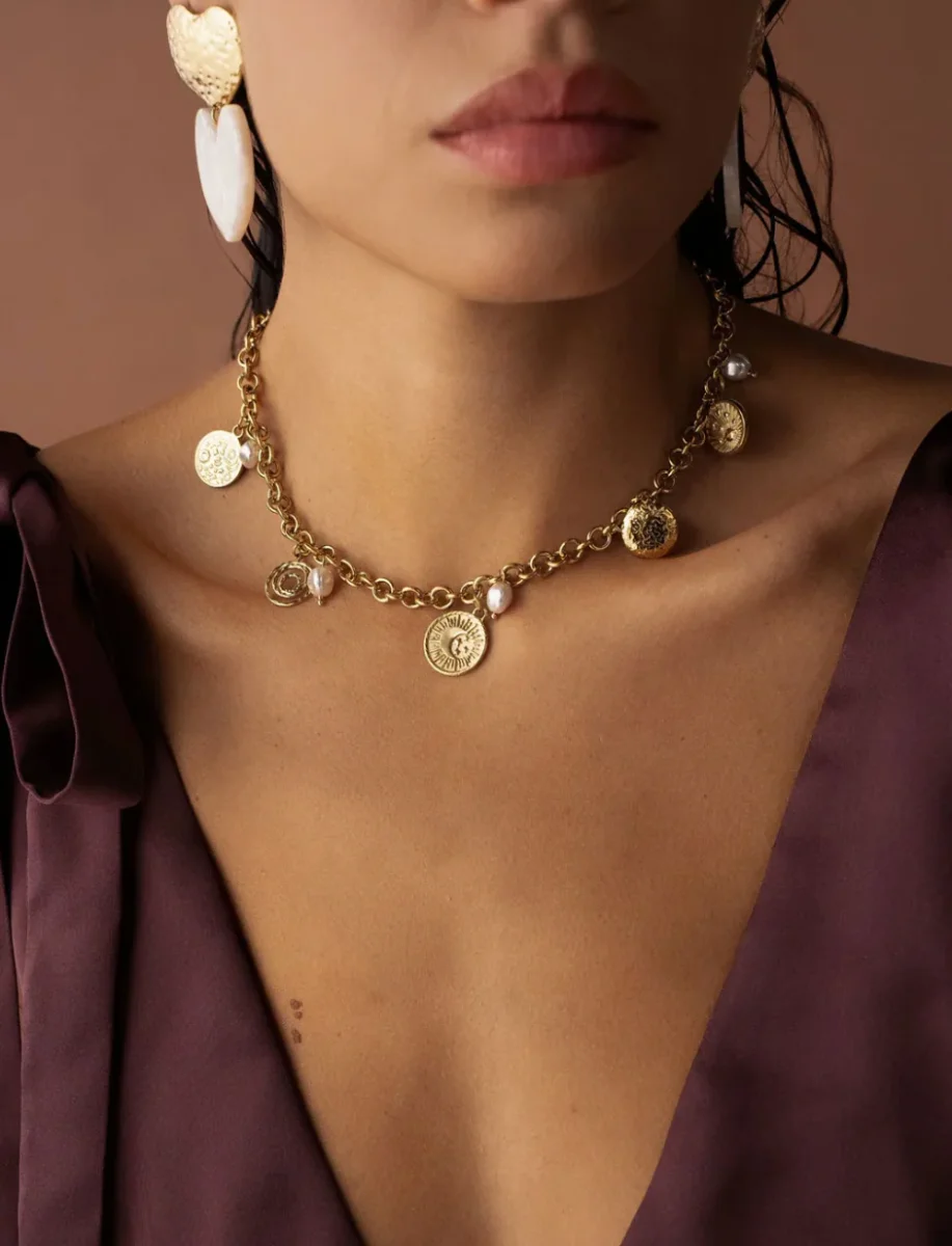 Plongez dans l’univers poétique du collier Tyra signé Bohm Paris. Sa maille jaseron épaisse s’orne de breloques inspirées du ciel — perles blanches, pampilles gravées de soleil, de lune et d’étoiles — pour un bijou à la fois symbolique et raffiné.