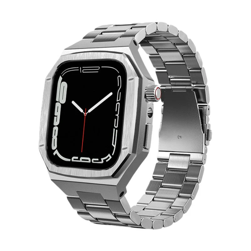Conçue pour métamorphoser votre montre connectée, cette pièce allie protection robuste et design affirmé. Le boîtier anguleux enveloppe parfaitement l’Apple Watch tout en laissant transparaître un cadran net et lisible, encadré par une silhouette contemporaine. Les bords sont nets, les finitions impeccables, donnant à l’ensemble une présence élégante et virile au poignet.