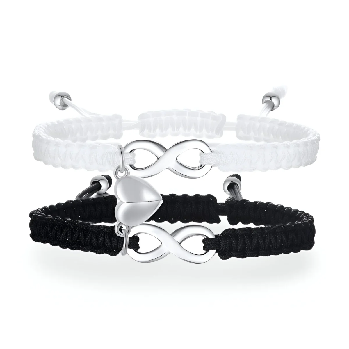 Ce bracelet pour couple célèbre l’union parfaite entre deux âmes, symbolisée par un motif infini en acier inoxydable. Le cordon tressé, disponible en noir et blanc, s’ajuste facilement pour un confort optimal, rendant ce bijou adapté à toutes les tailles. Au centre, un demi-coeur aimanté complète l’infini, créant une connexion magnétique qui rapproche les deux moitiés, tout comme votre amour. Ce bracelet incarne un lien fort et durable, unissant deux personnes à travers le temps et l’espace, tout en ajoutant une touche moderne et élégante à votre style quotidien.