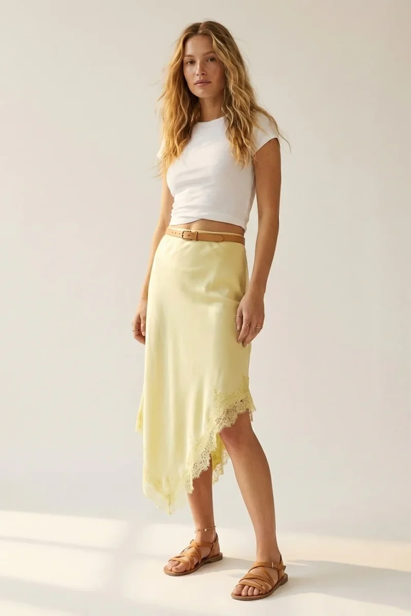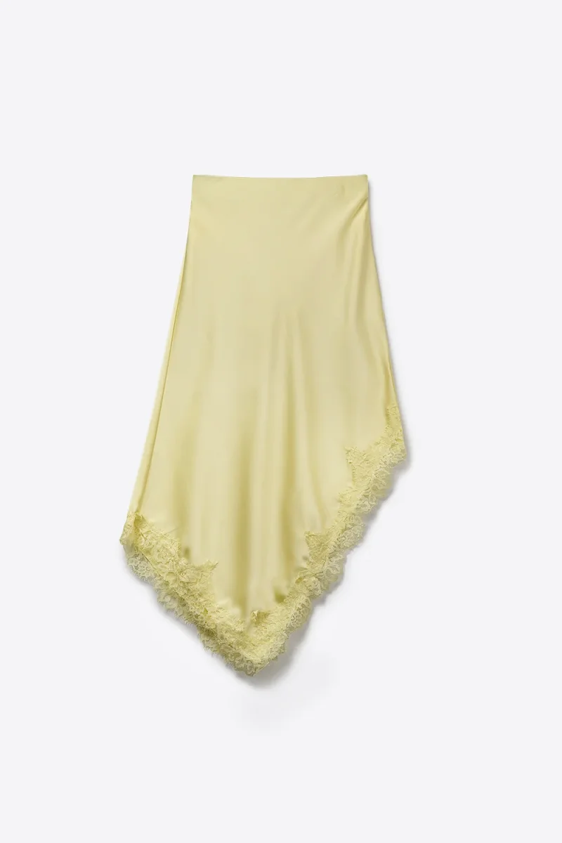 Une jupe fluide en satin qui capte la lumiere avec subtilite et accompagne chaque mouvement. Sa teinte jaune beurre et sa finition en dentelle apportent une touche delicate, ideale pour des looks feminins et faciles a composer.