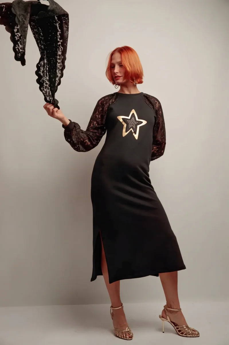 Une robe longue au charme moderne, où la féminité rencontre la touche graphique. Son mélange de maille douce et de dentelle raffinée sublime la silhouette, tandis que l’étoile dorée sur le devant attire la lumière avec élégance.