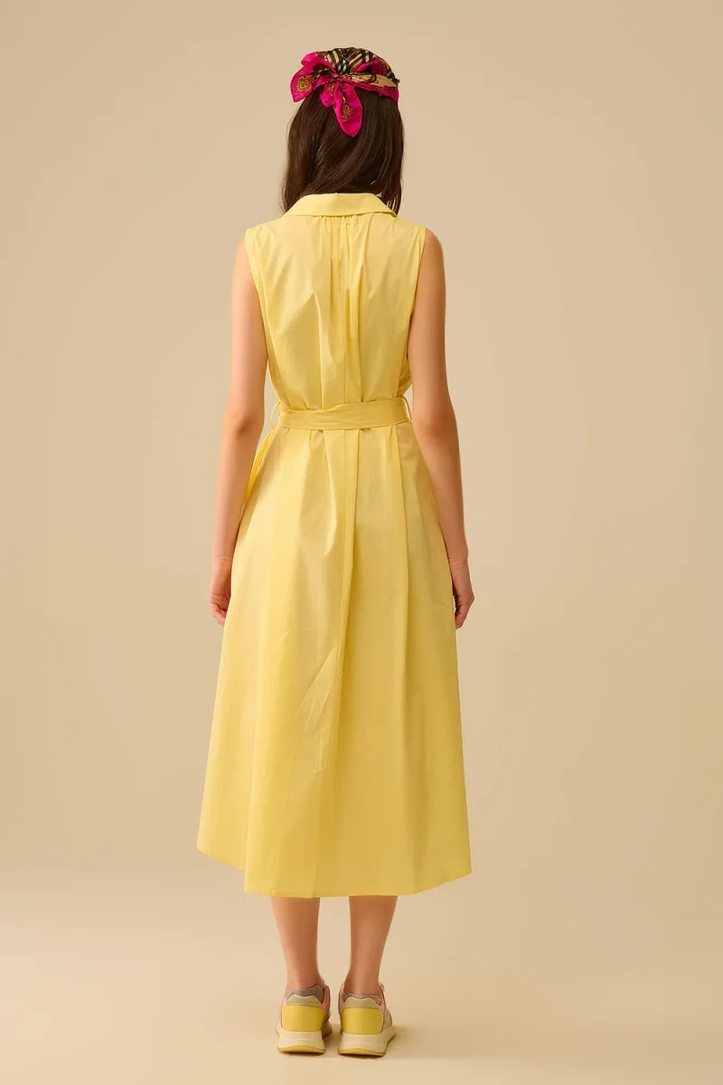 Rayonnez tout l’été avec cette robe midi en popeline jaune, douce et légère. Son design sans manches et ses boutons en forme de cœur insufflent une note enjouée à une silhouette féminine et structurée.