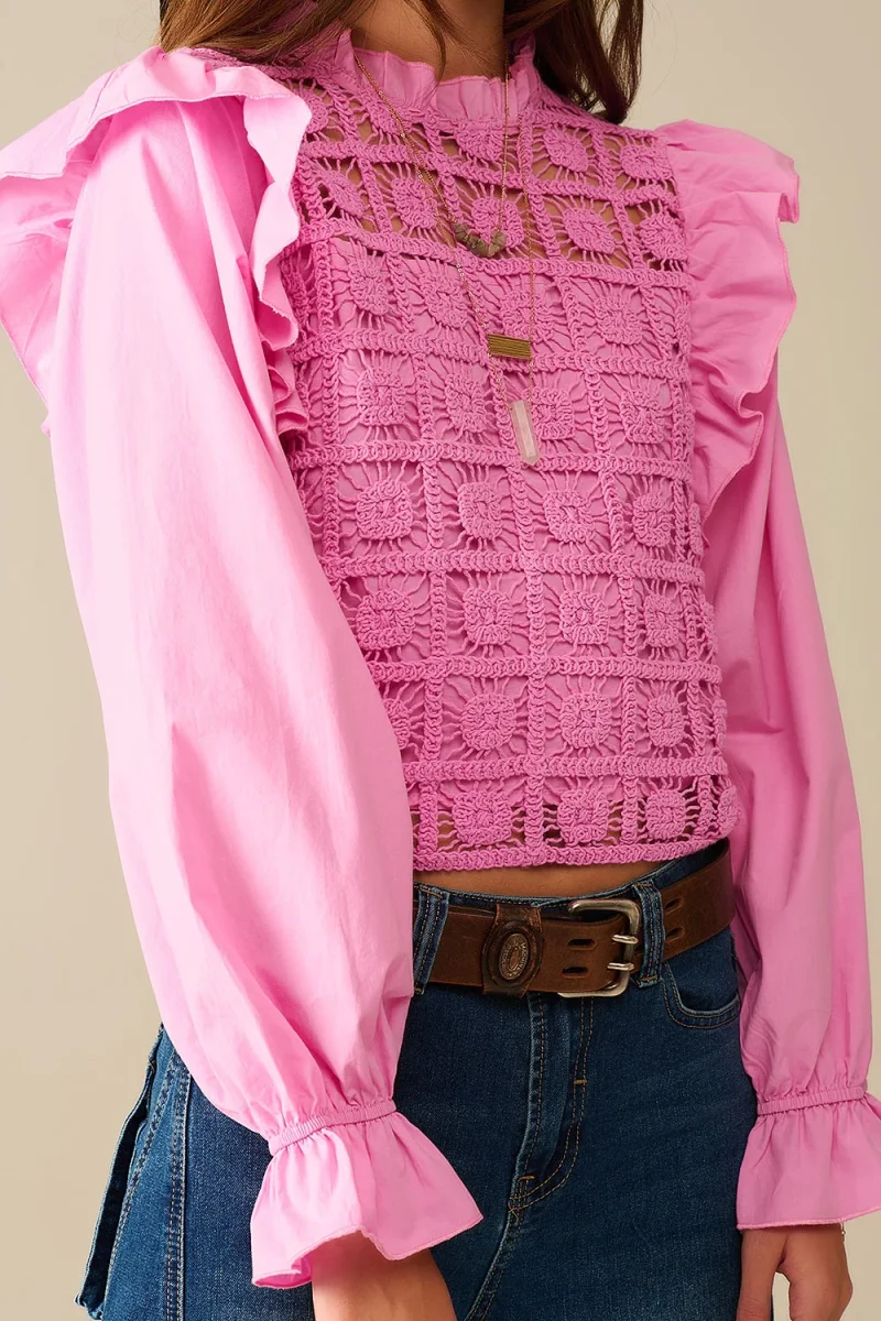 Élevez vos tenues du quotidien avec ce top rose à la fois délicat et texturé. Son panneau central en crochet travaillé main et ses manches longues bouffantes en popeline donnent un relief unique à cette pièce romantique. Une silhouette tout en douceur, pensée pour captiver sans en faire trop.