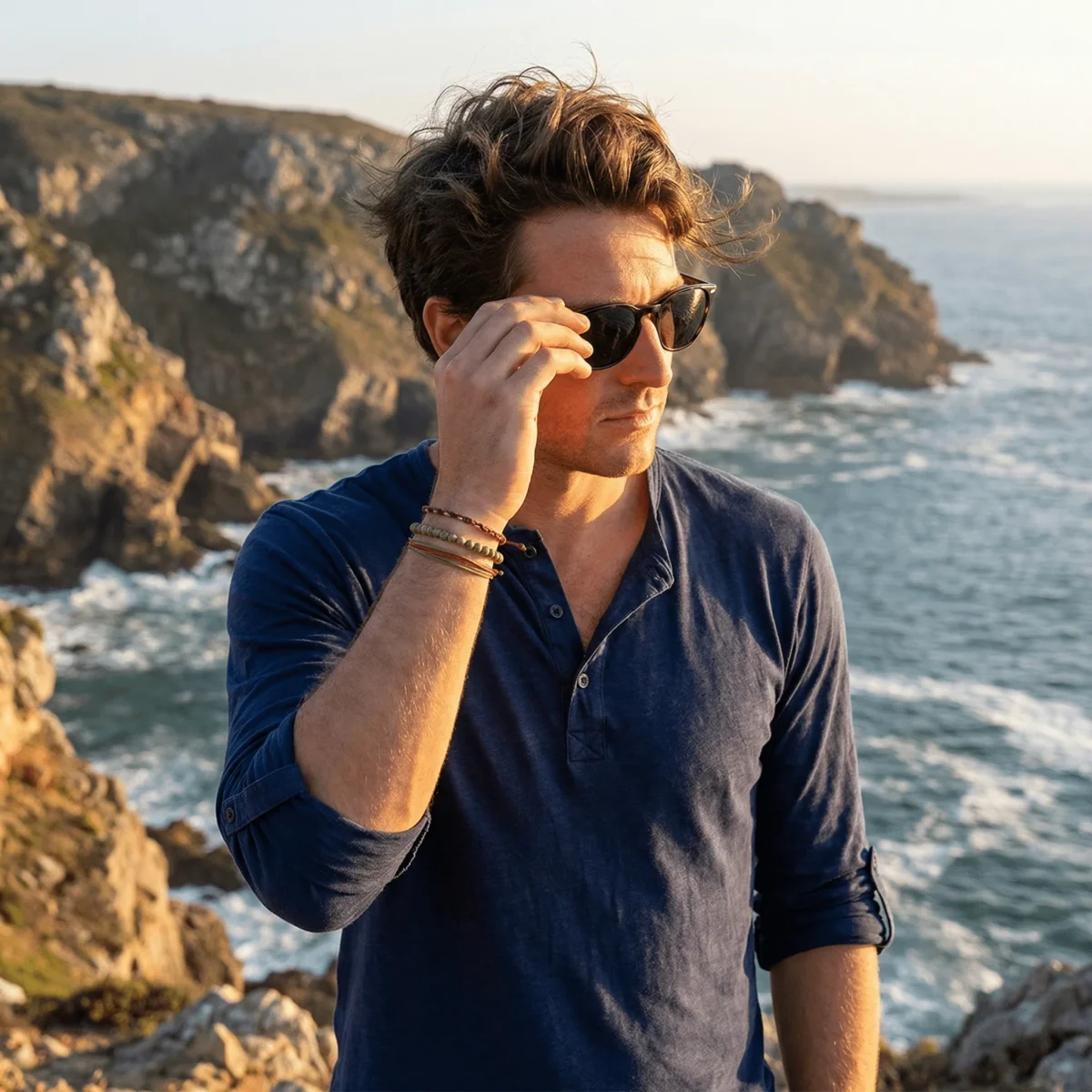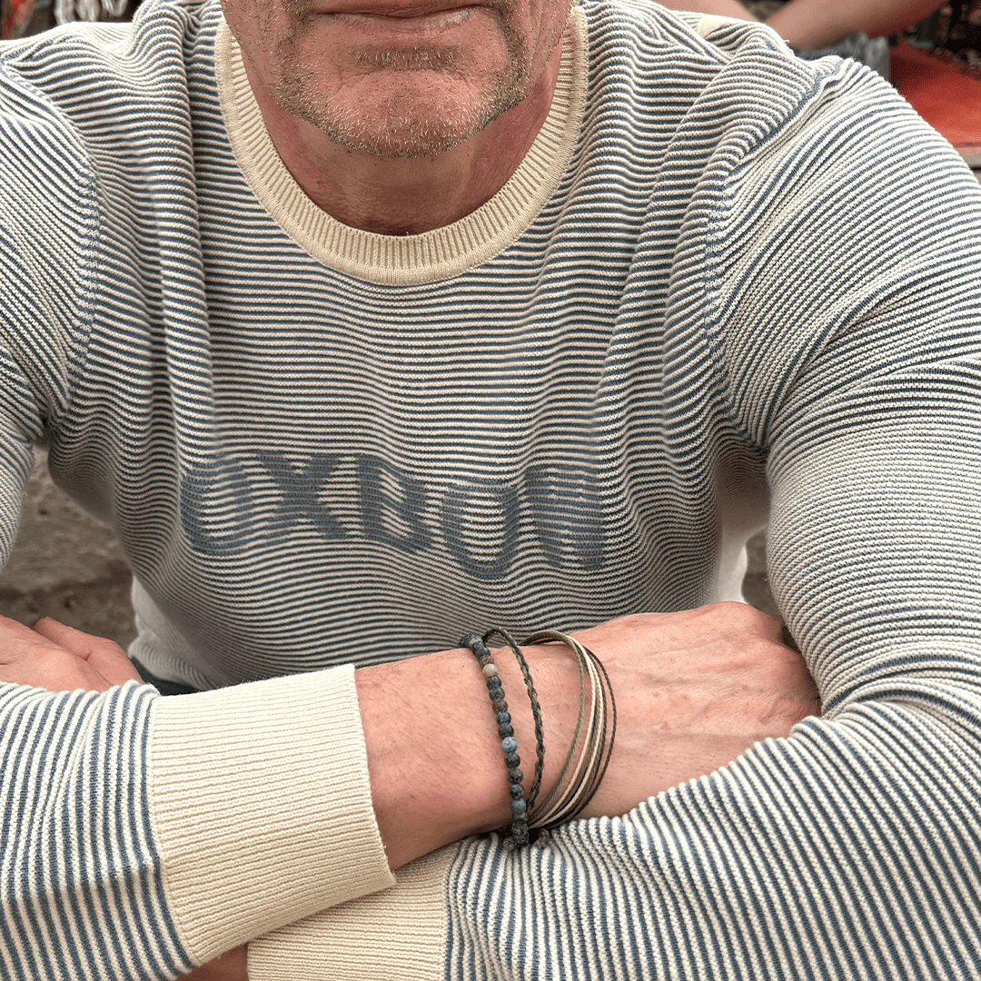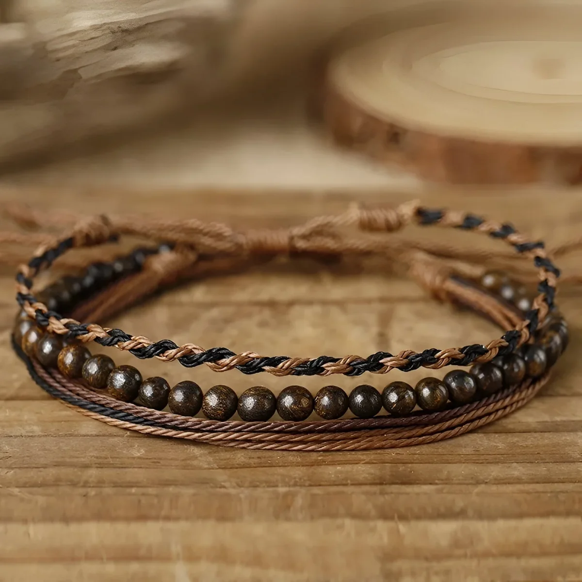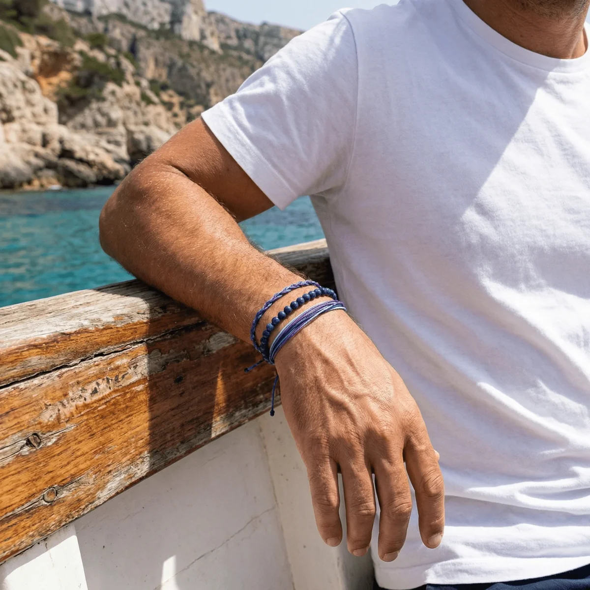 Le premier bracelet de ce trio présente un tressage délicat de fils cirés, créant un look à la fois moderne et intemporel. Le deuxième bracelet est orné de perles de pierre naturelle aux nuances chatoyantes, offrant une touche de couleur et de charme. Enfin, le troisième bracelet combine habilement des fils de différentes couleurs, formant un ensemble harmonieux et équilibré qui attire le regard.